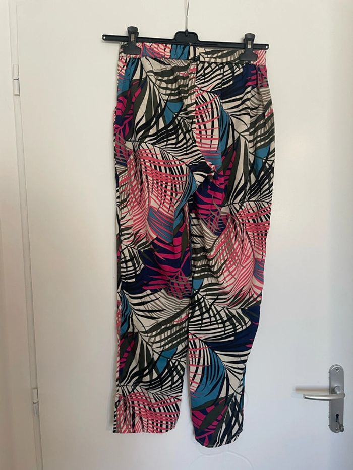 Bonjour je vends un Pantalon léger taille haute élastique motifs feuillage rose kaki multicolore neuf Tex taille XS Il est neuf il y a toujours les étiquettes #tiatia_femme_taille34
