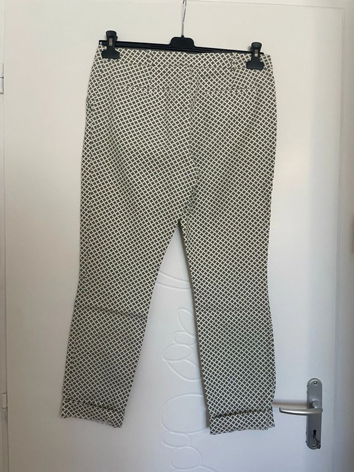Pantalon court 7/8 habillé taille haute blanc crème à motifs moutarde vert foncé promod taille 40 - photo numéro 2