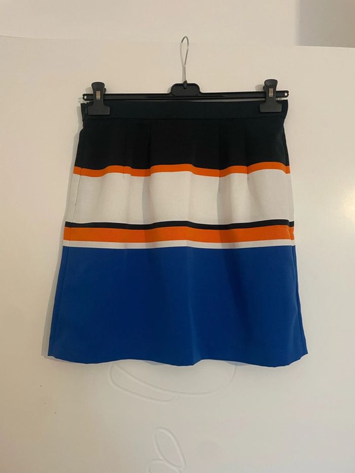 Bonjour je vends ma Jupe bas évasé taille haute à rayures blanc bleu marine orange et bleu promod taille 38 Elle est en excellent état porté que 2 fois #tiatia_femme_taille38