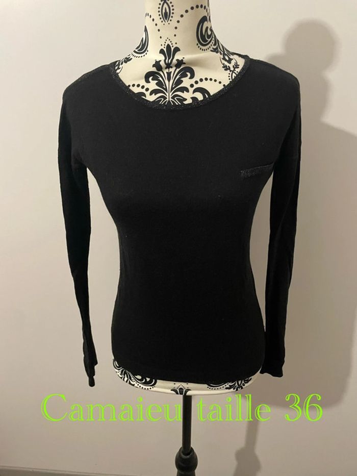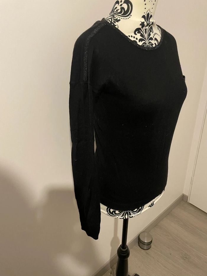 Bonjour je vends mon Pull noir à manches longues petite poche poitrine bordure argenté ouvert dos camaïeu taille 36 Il est en très bon état très peu porté #tiatia_femme_taille36