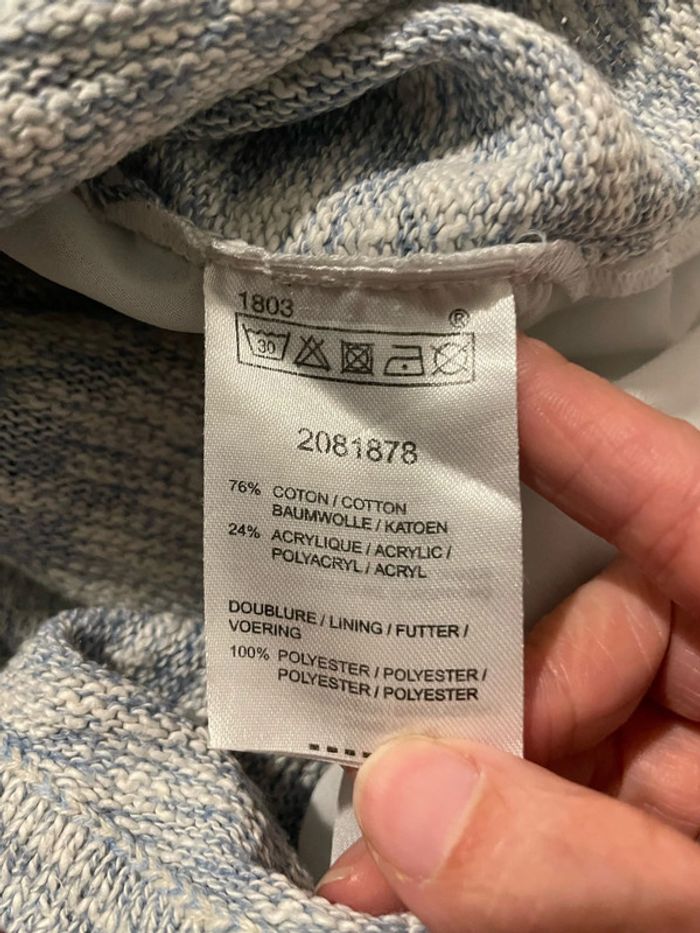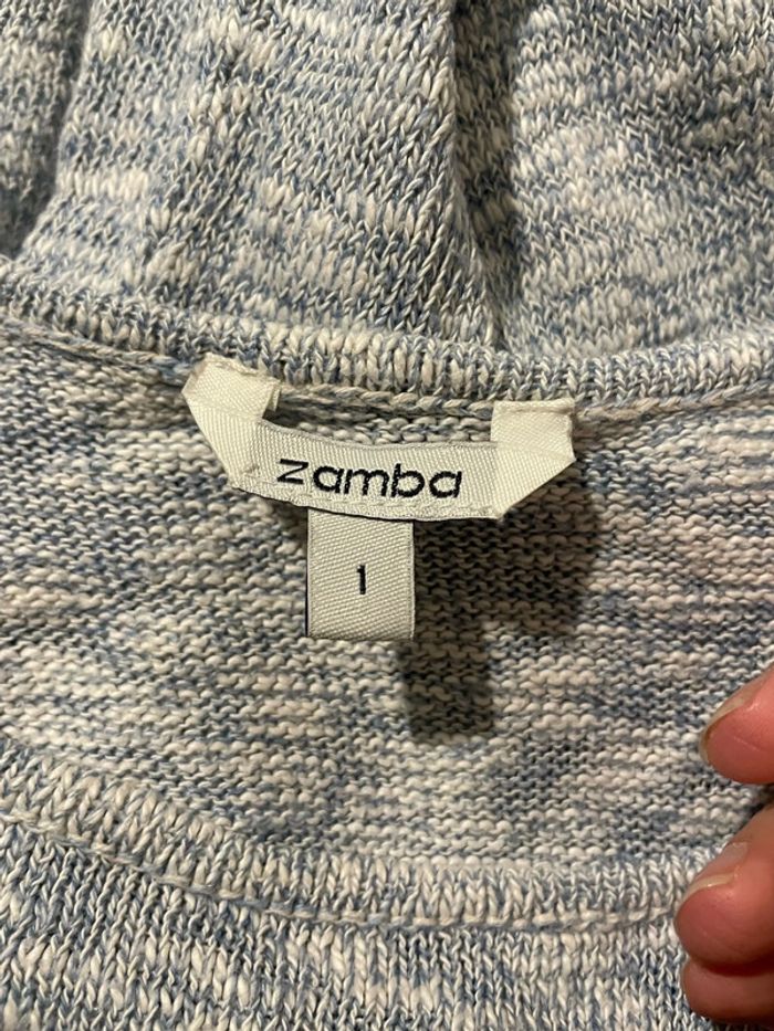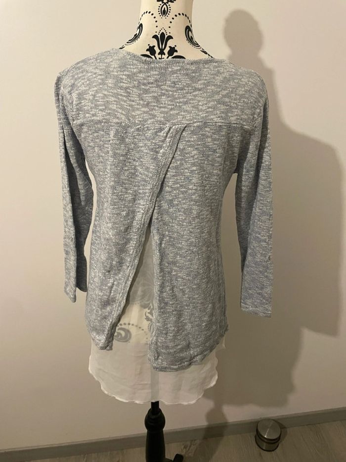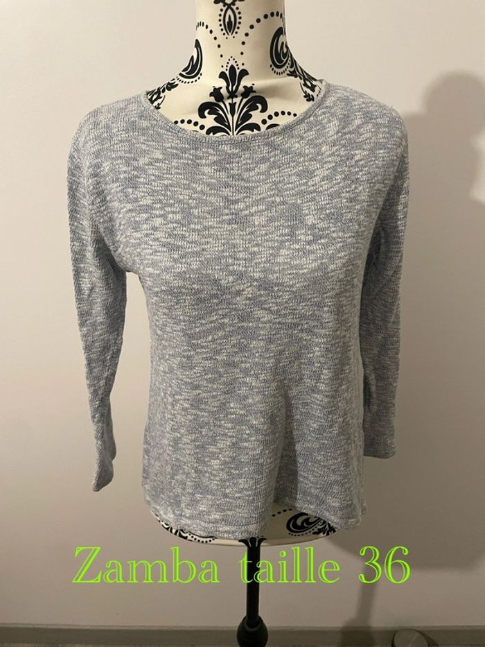 Bonjour je vends mon Pull à manches longues bleu chiné blanc style chemise en voile longue dos zamba taille 36 Il est en excellent état très peu porté #tiatia_femme_taille36