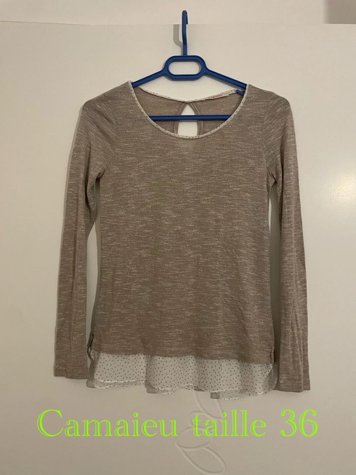 Pull à manches longues beige effet chemise blanc à pois beige camaïeu taille 36 - photo numéro 1
