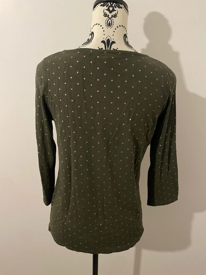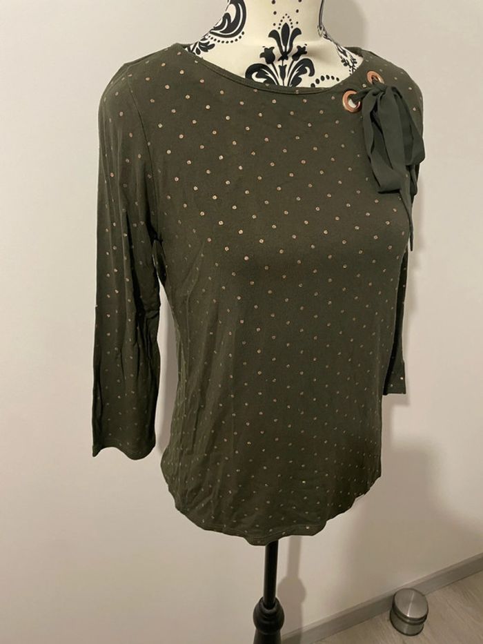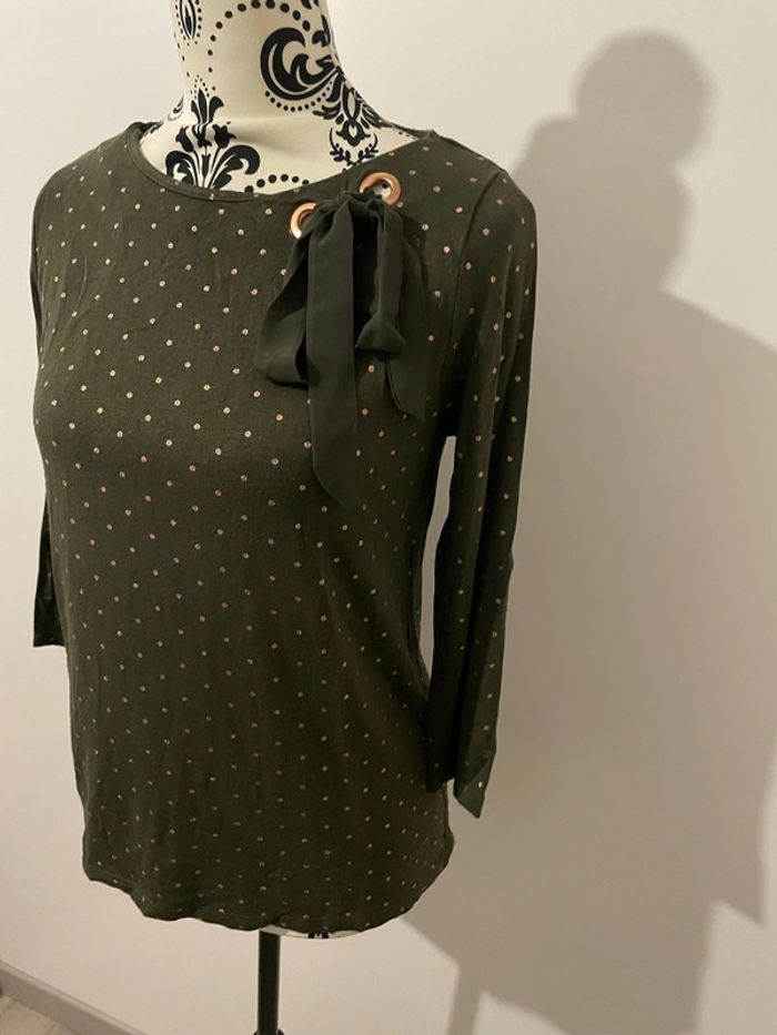 Pull manche 3/4 kaki à pois doré col rond noeud col grain de malice taille S - photo numéro 1