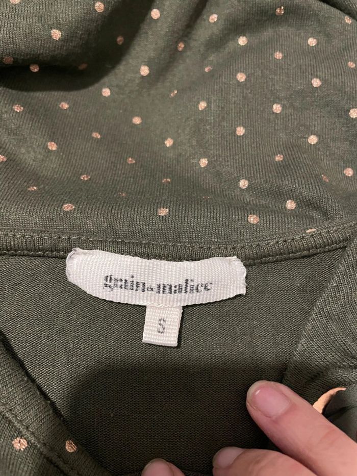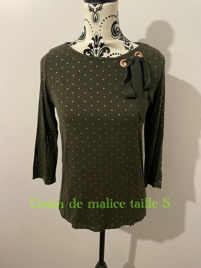 Bonjour je vends mon Pull manche 3/4 kaki à pois doré col rond noeud col grain de malice taille S Il est en excellent état très peu porté #tiatia_femme_taille36