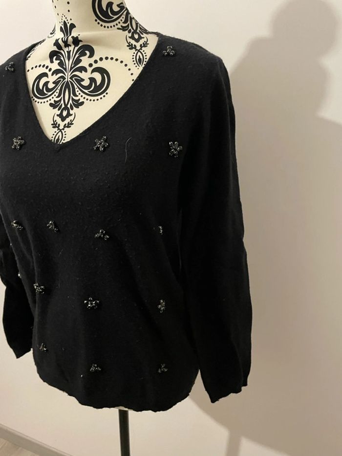 Pull tout doux noir à manches longues perlé strass devant col V Jacqueline Riu taille 38 - photo numéro 3