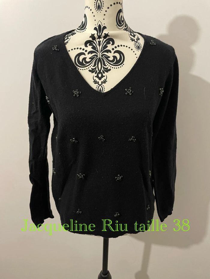 Pull tout doux noir à manches longues perlé strass devant col V Jacqueline Riu taille 38 - photo numéro 1