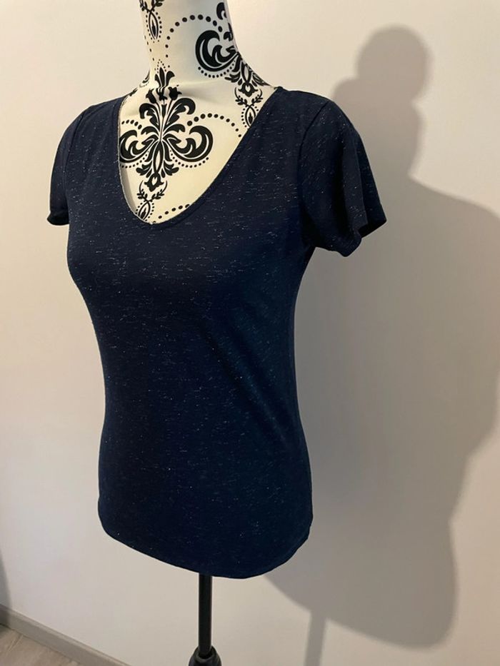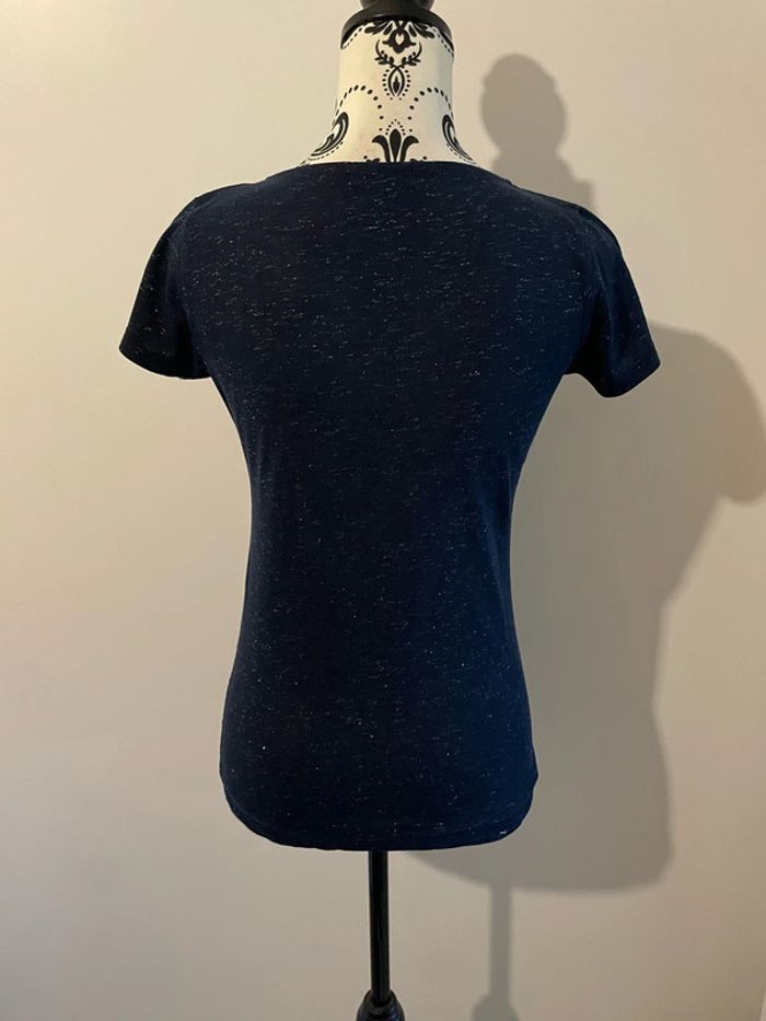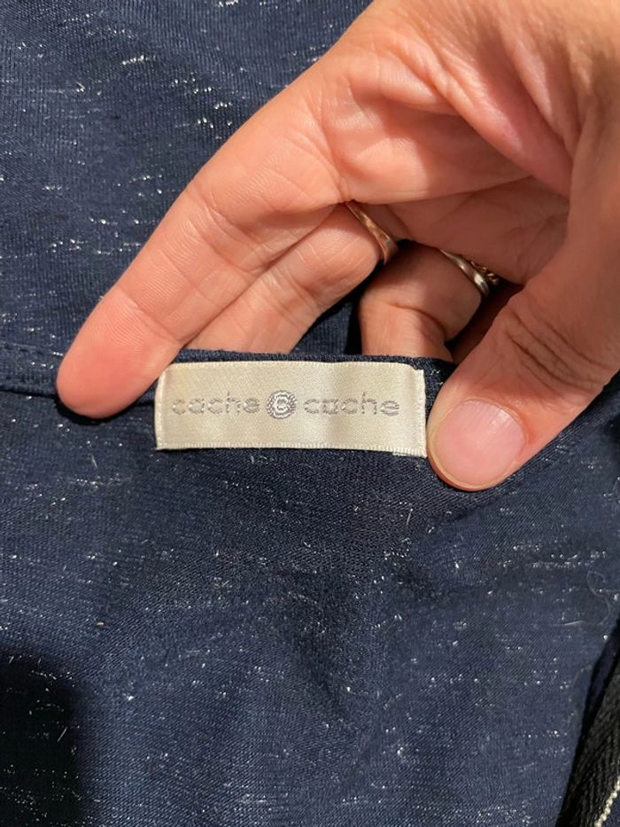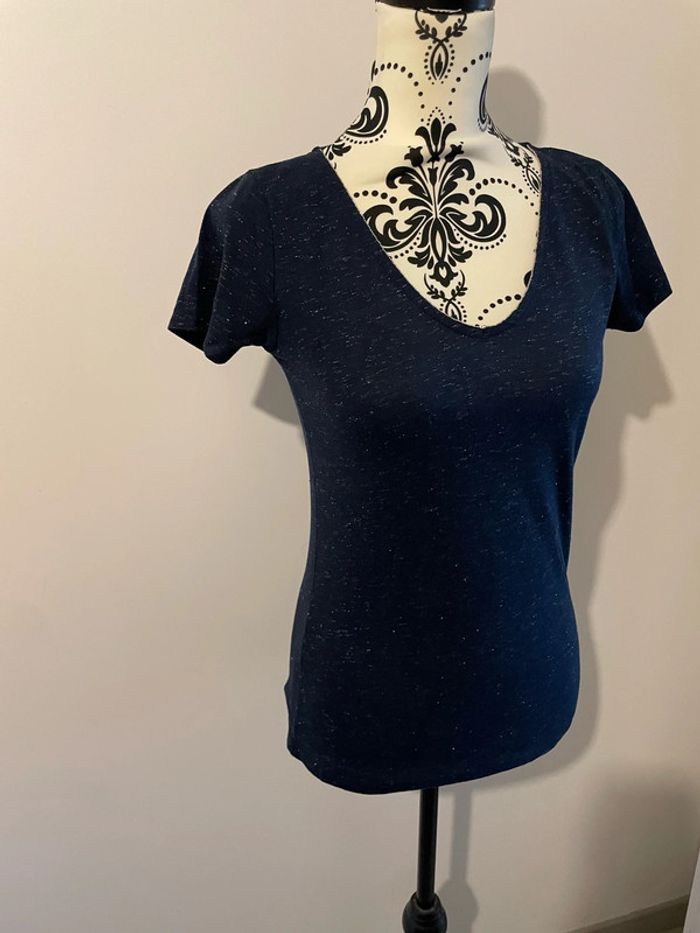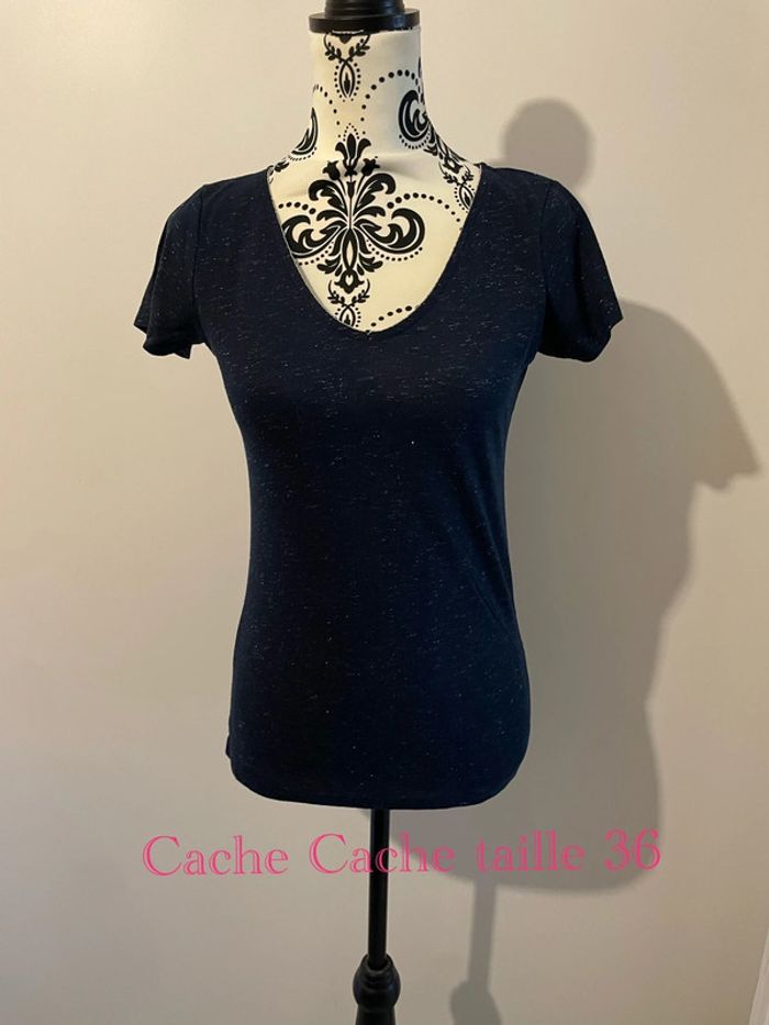Bonjour je vends mon T-shirt à manches courtes extensible bleu marine et argenté col V Cache Cache taille 36 Il est en très bon état très peu porté #tiatia_femme_taille36