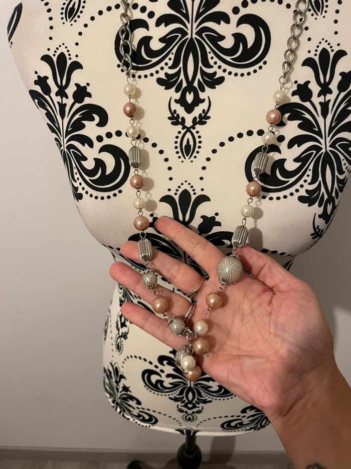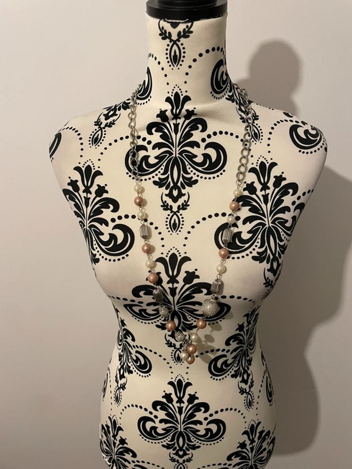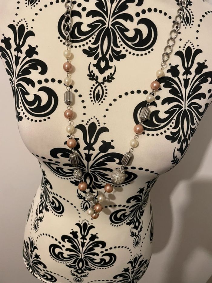 Bonjour je vends mon Collier long saut gris argenté perle rose clair et blanc il est en excellent état