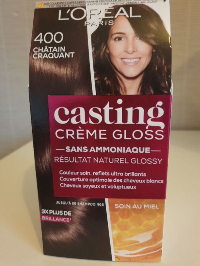 A vendre soin du cheveux CASTING crème gloss (L'ORÉAL) dans l'emballage il y a 1 crème colorante 48ml et 1 lait révélateur 72ml et 1 soin réutilisable enrichi en miel 60ml et 1 paire de gants de protection et 1 notice d'utilisation. Produit neuf jamais utilisé toujours dans sa boîte d'origine.