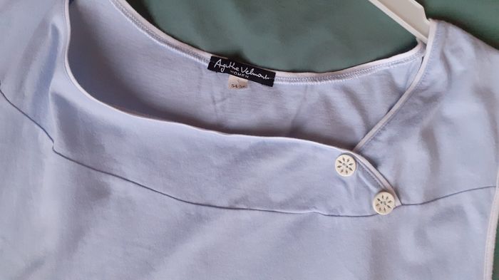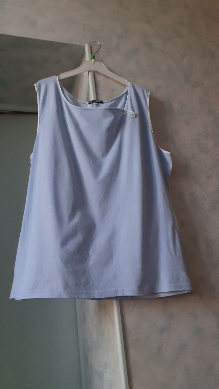 Vends un débardeur 100 % coton, forme légèrement trapèze, couleur bleu ciel uni avec emmanchures et encolure blanche, 2 boutons sur un côté, marque Agathe Velmont, taille 54-56 sur l'étiquette mais d'après les mesures plutôt 50-52. Longueur de l'épaule à la base : 71 cm Largeur aisselle à aisselle : 58 cm
