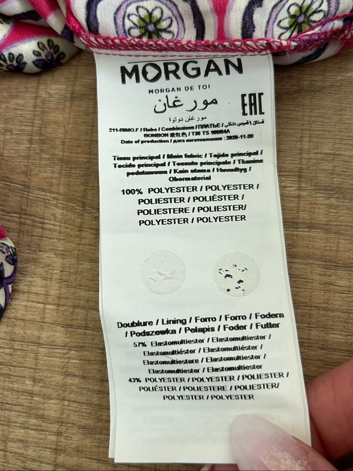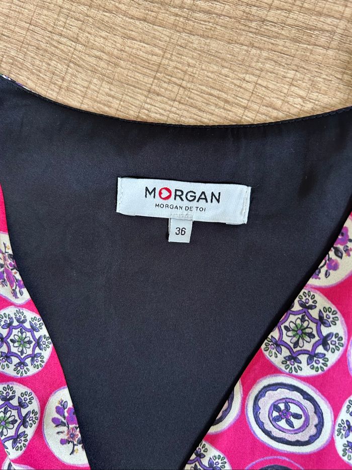 Magnifique robe portefeuille satinée à manches longues, de marque Morgan. Taille 36. Jamais portée, état neuf. aisselle à aisselle 40 cms épaule à épaule 35 cms longueur manches 62 cms taille 36 cms longueur depuis épaule 88 cms 100% polyester