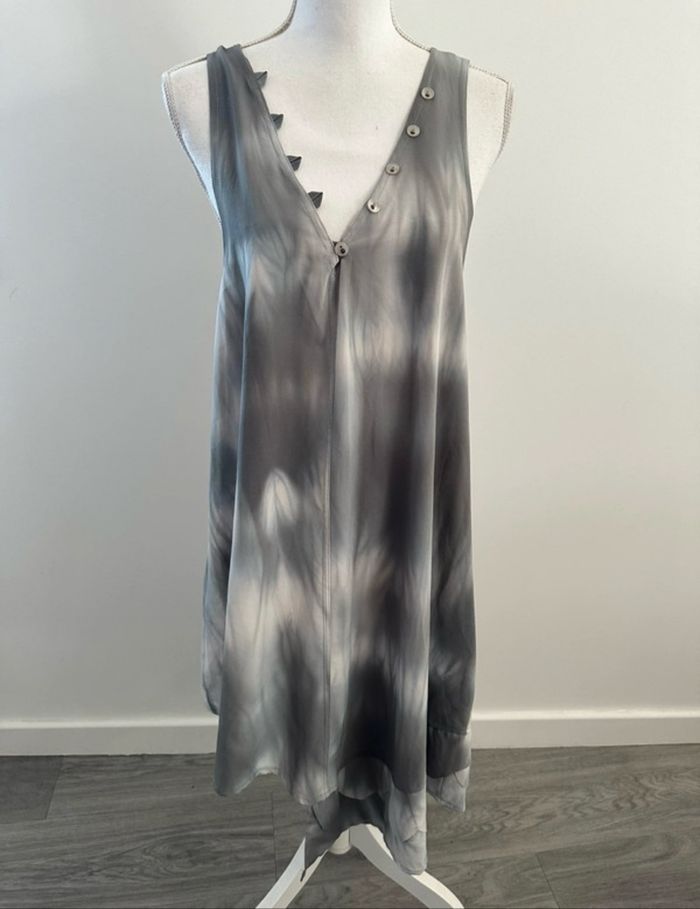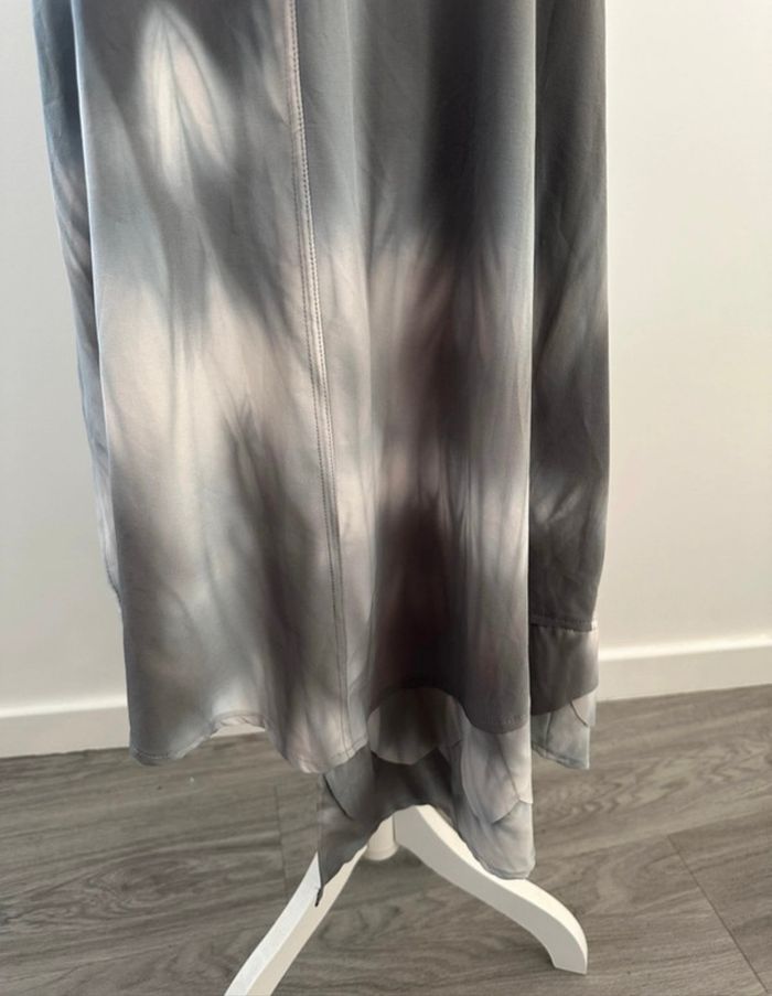 Robe - Excellent état - Taille 2 équivalent 38 M - Grise et blanche - Tissus tie and dye - Coupe asymétrique - Fabrication française 🇫🇷 - Polyester et Lycra - Col en V avec des boutons - Style Y2K - Vintage, années 80’ - Polyester et Lycra