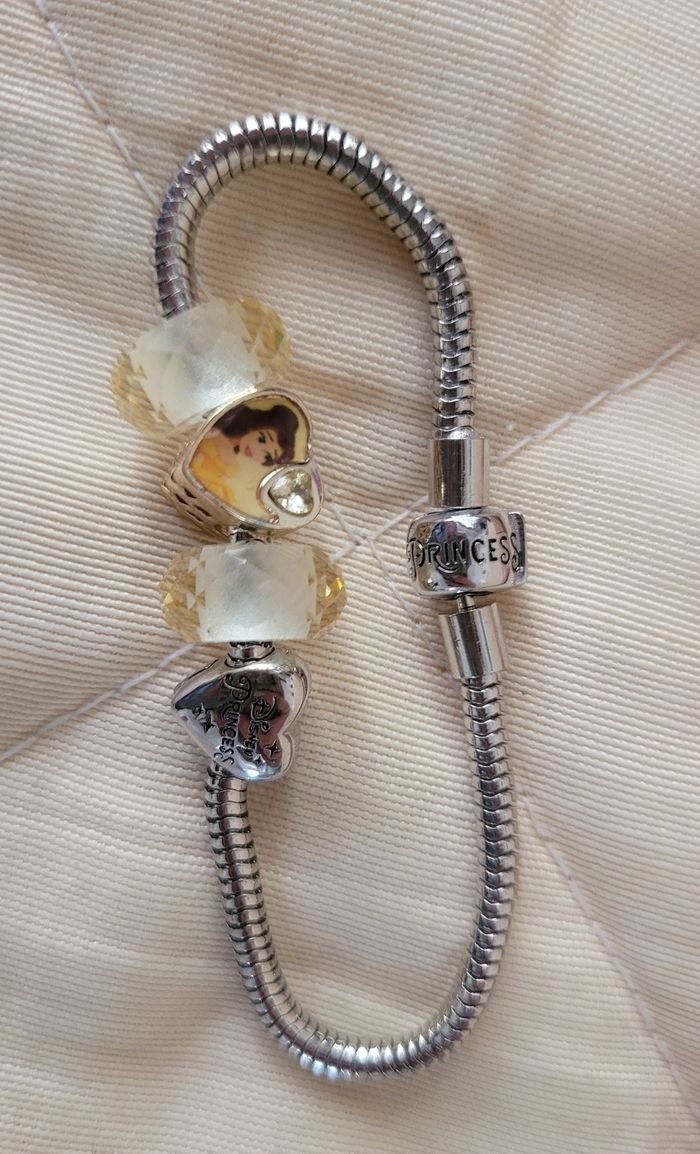 Bracelet enfant avec charms de Belle. Plus 6 autres sets neufs jamais ouverts de 3 perles des princesses Aurore, la petite sirène, Mulan, Pocahontas, Raiponce et Vaiana Produit shopdisney qui a sorti un set de perles par mois. #disneytattoogirl_3 #jouetstattoogirl_3