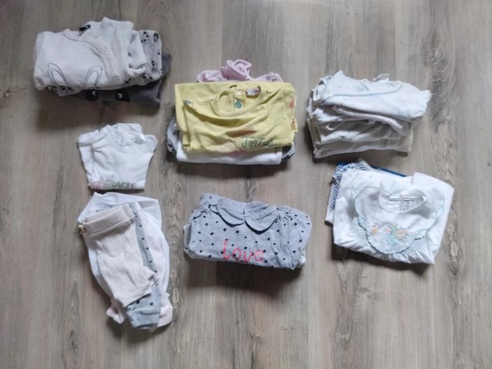 Lot de vêtements fille 1 mois -6 bodys -3 combi - 1 Tshirt -3 pulls -4 pantalons -1 robe -1 blouse -3 pyjamas Composé de 22 pièces En bon état