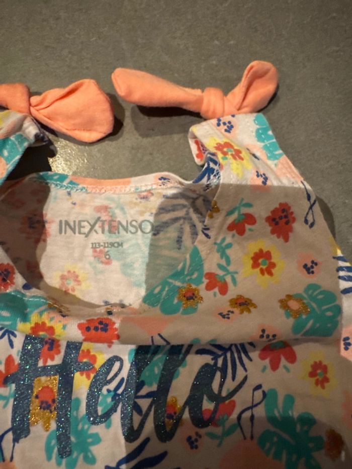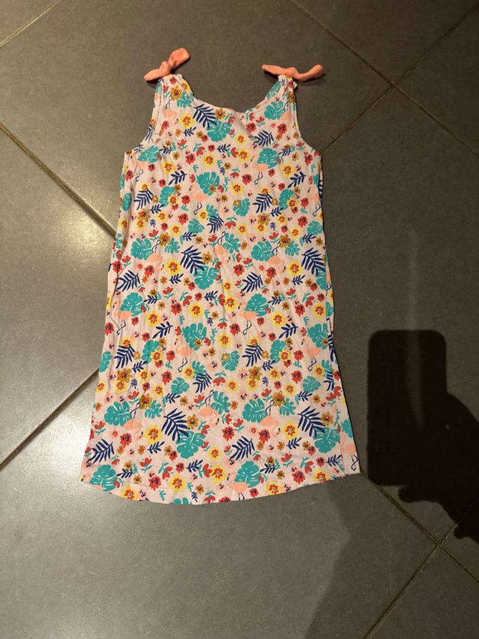 Robe avec noeuds aux bretelles Marque: In extenso Modèle: Hello flamingo / Feuilles / Fleurs Couleurs: Rose, vert, bleu, jaune & doré Taille: 6 ans Très bon état (voir les photos) D'autres articles de marques pour fille dans mon dressing W