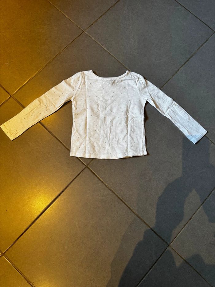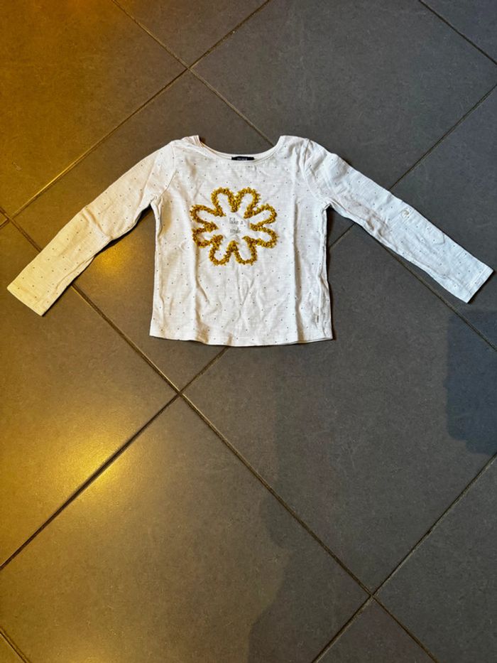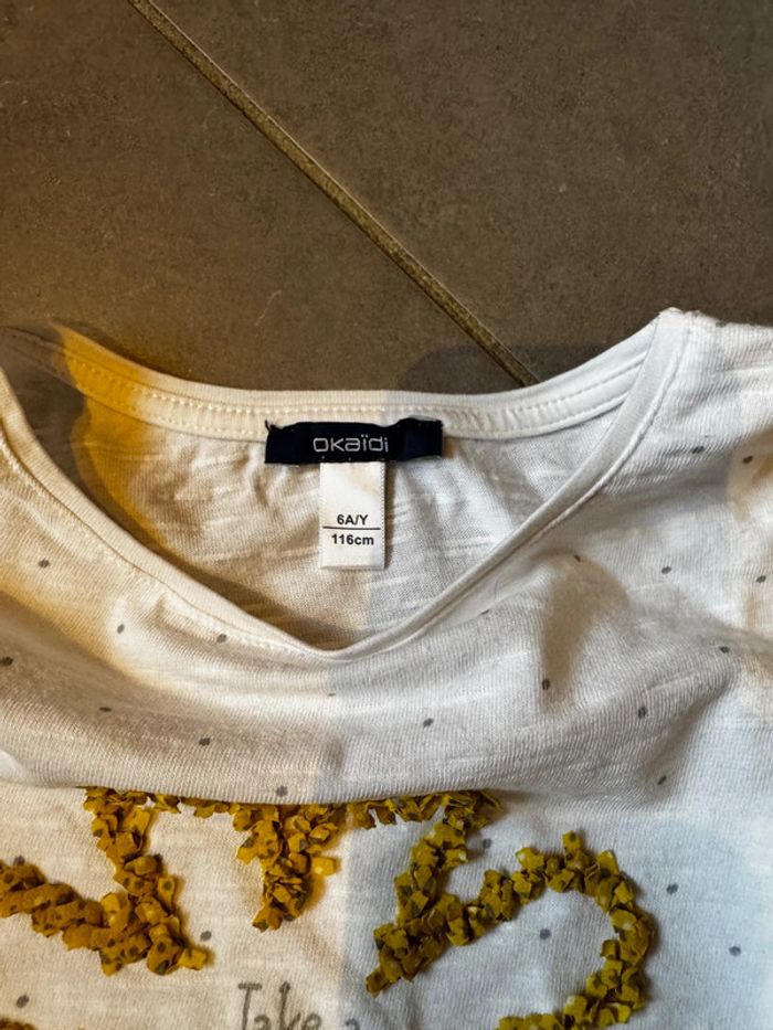 T shirt manches longues à pois avec possibilité de remonter les manches à l’aide d’un bouton Marque: Okaidi Modèle: Fleurs / Take a smile Couleurs: Blanc, gris & jaune Taille: 6 ans Très bon état (voir les photos) D'autres articles de marques pour fille dans mon dressing W