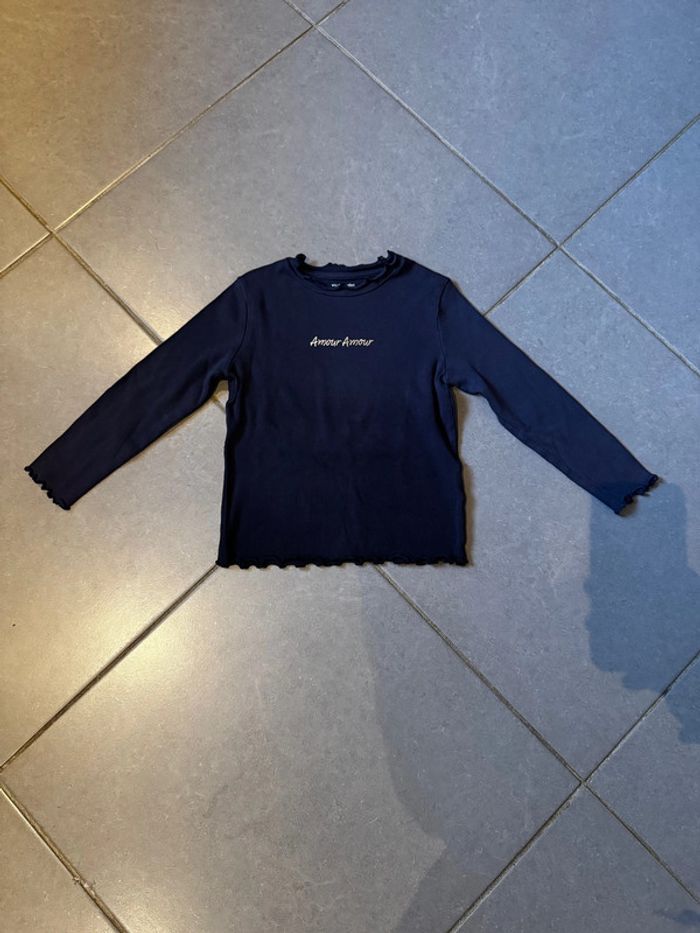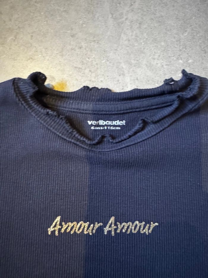 T shirt manches longues Marque: Vertbaudet Modèle: Amour Couleurs: Bleu marine & doré Taille: 6 ans Très bon état (voir les photos) D'autres articles de marques pour fille dans mon dressing W