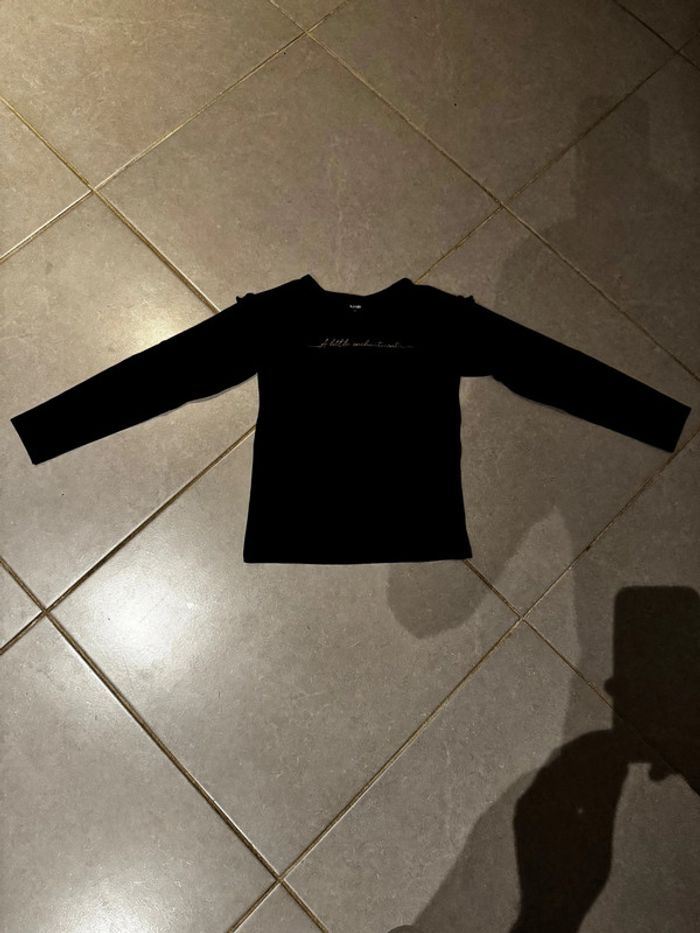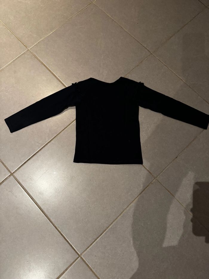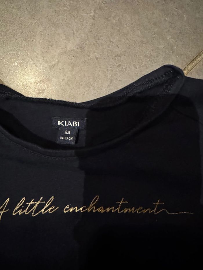T shirt manches longues avec froufrous aux épaules Marque: Kiabi Modèle: A little enchantement Couleurs: Bleu marine & doré Taille: 6 ans Très bon état (voir les photos) D'autres articles de marques pour fille dans mon dressing W