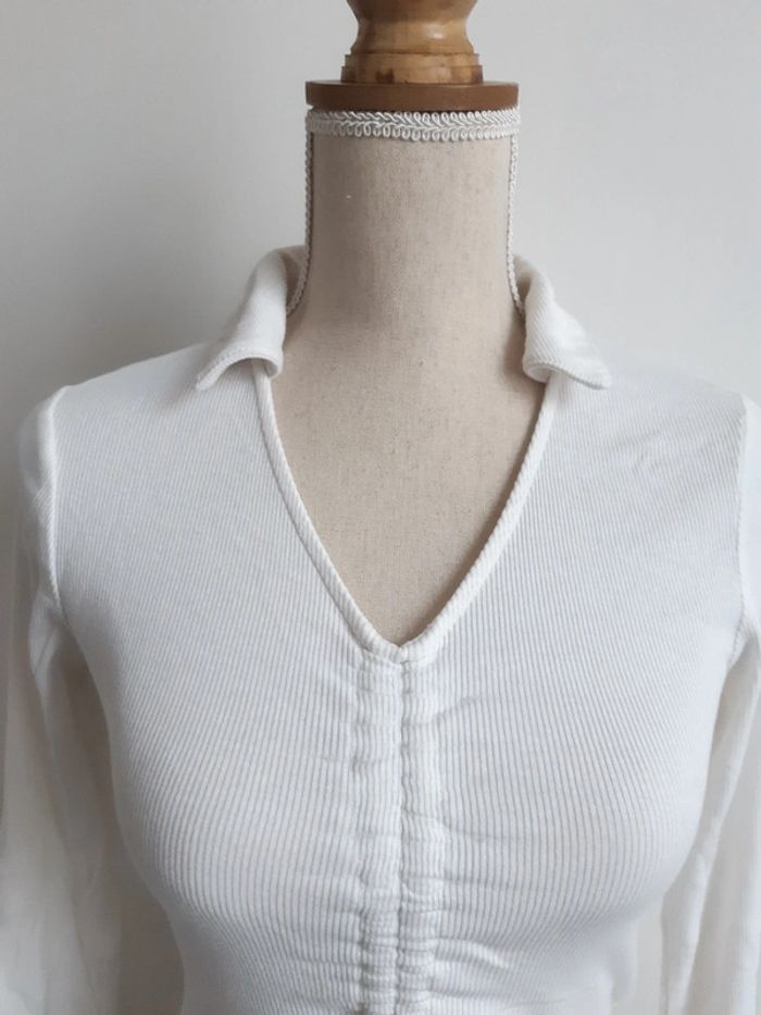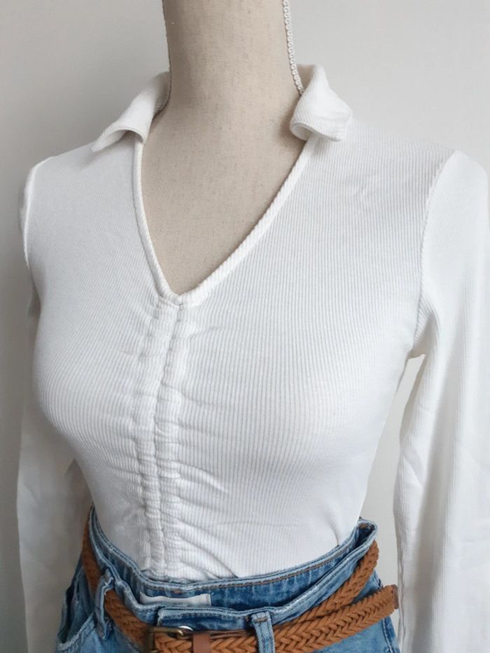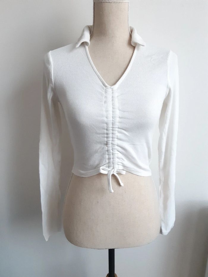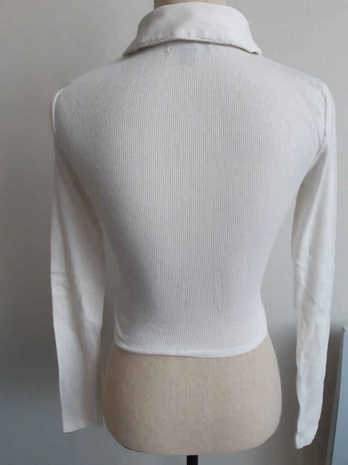 Top blanc court Manches longues Côtelé Col V, col chemise Près du corps/moulant Lacet à nouer sur le devant, permet d'ajuster la longueur Taille XS/34 Kiabi #anthonyagnes_femme34