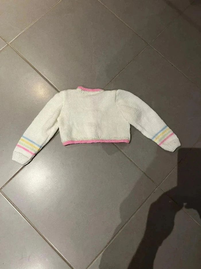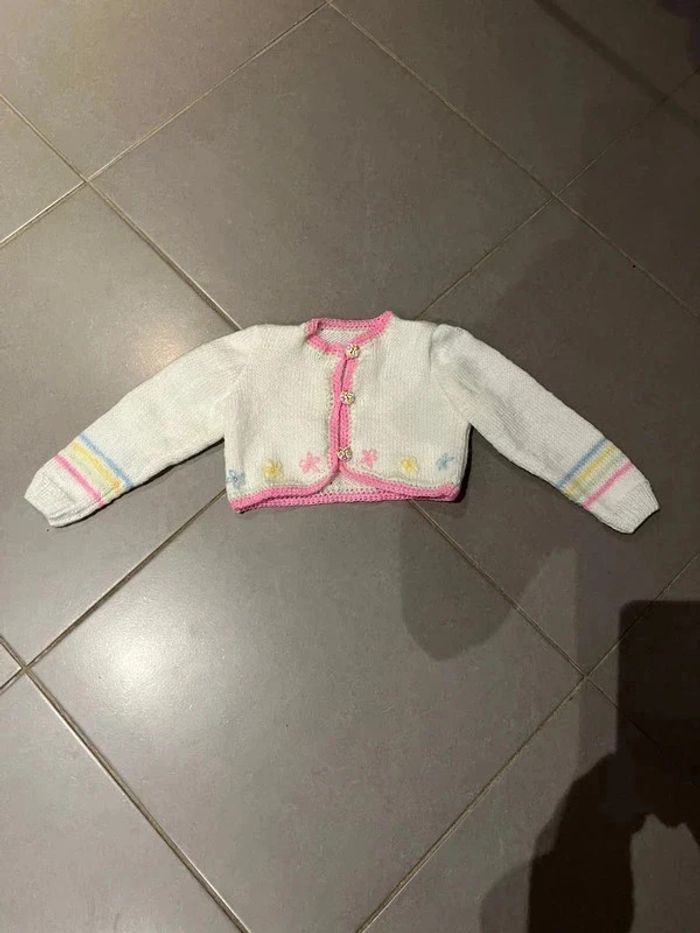 Gilet / Boléro à boutons Marque: Tricoté à la main / Fait maison Modèle: Fleurs Couleurs: Blanc, rose, vert, jaune & bleu Taille: 18 / 24 mois Très bon état (voir les photos) D'autres articles pour fille dans mon inventaire