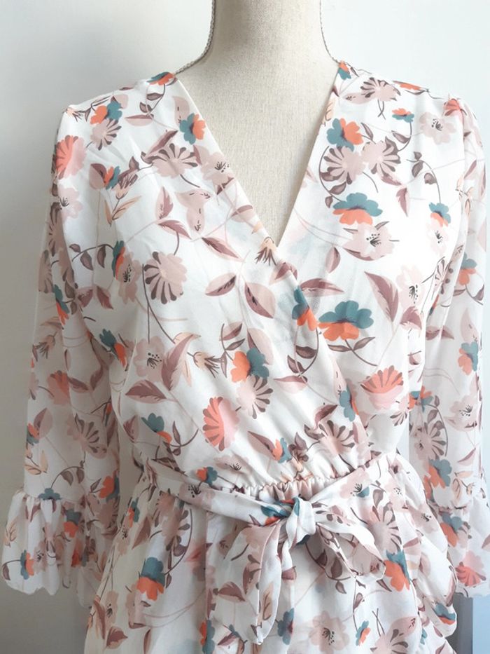 Robe col V Fluide Doublée Motif fleurs Manches longues Ceinture à nouer Convient pour une taille S Légers défauts voir photos #anthonyagnes_femme36