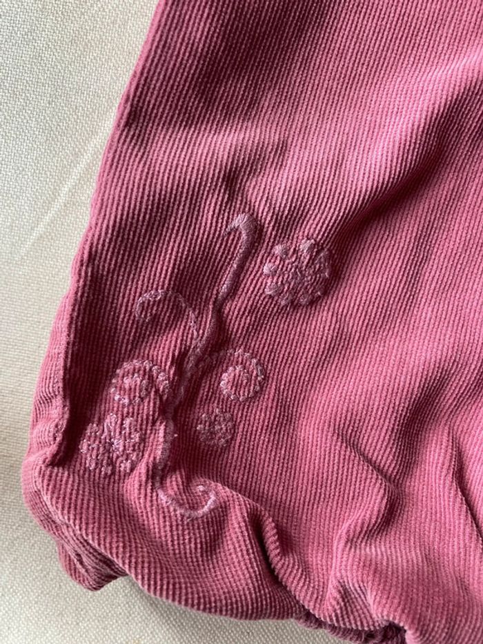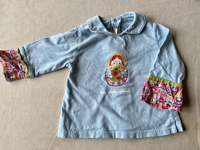 Ensemble catimini et Tao 12 mois hiver Chemisier bleu, dessin sur poitrine matriochka fleurie, bout des manches assorties, fermeture au dos Pantalon en velours milleraies bordeaux Tao + broderies tons sur tons En TBE Fouillez dans mon dressing 😊, bcp d’habits bébé fille, je fais des prix en cas de lot !