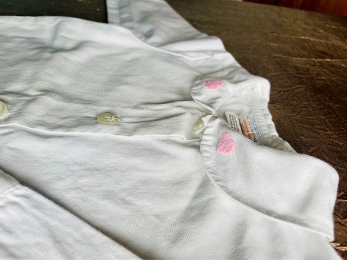 En réalité j’offre le gilet qui a été bcp porté . Il est assez epais et bouloche. D’où le petit prix global Chemiser col Claudine blanc cassé, brodé cœurs. Facile d’entretien. Col bien blanc. Fouillez dans ma dressing !