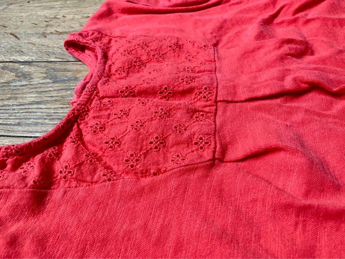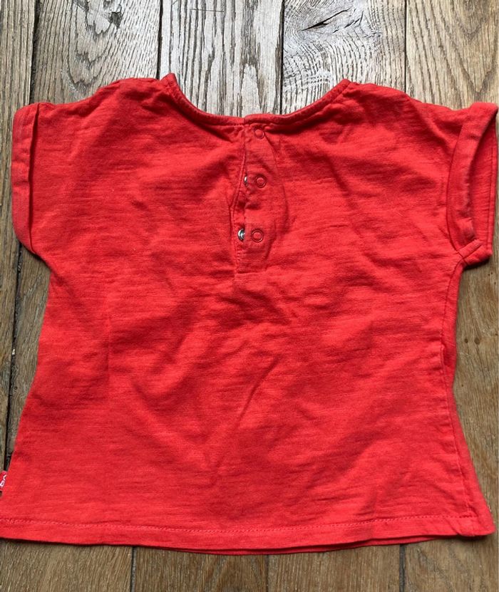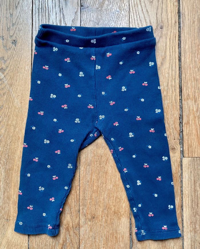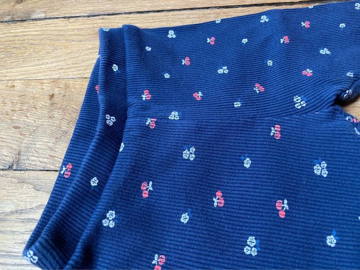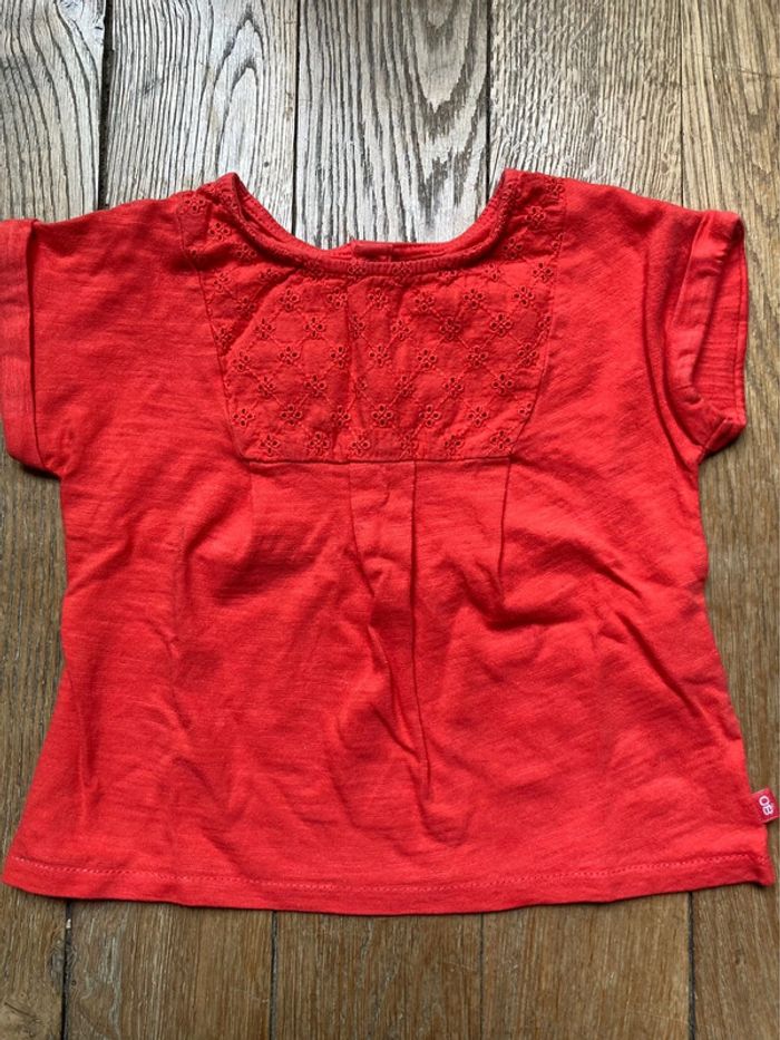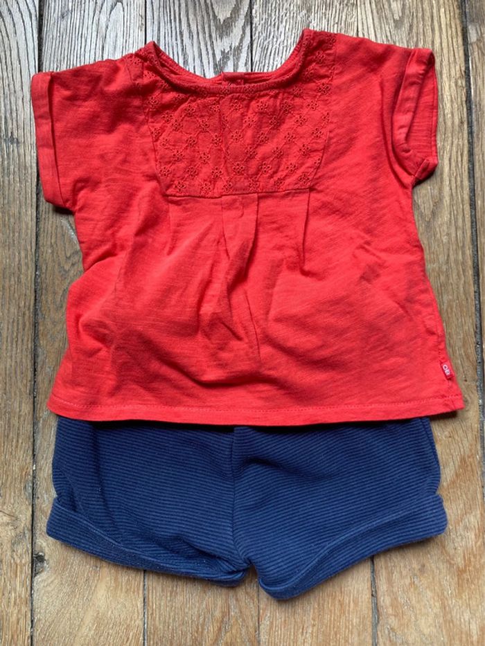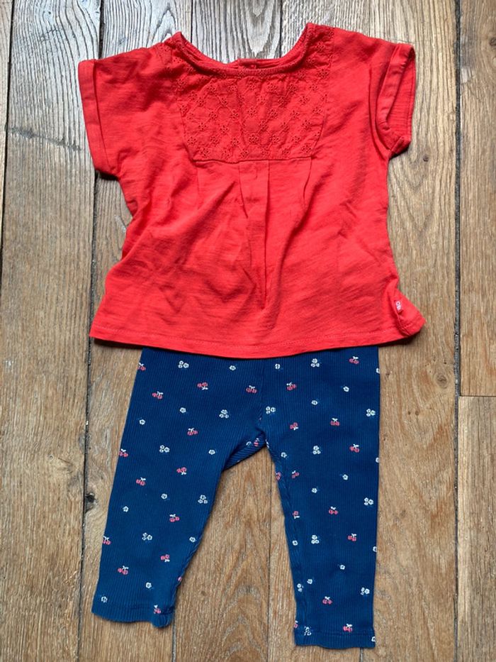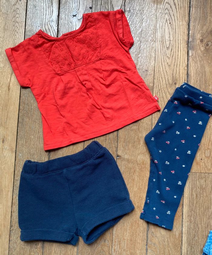 Ensemble 3 pièces Obaibi 12 mois 1 Tee-shirt rouge avec empiècement dentelle anglaise 1 legging bleu marine motifs cerises 1 bloomer / short bleu marine Portés par un seul enfant En TBE D’autre 12 mois en vente !