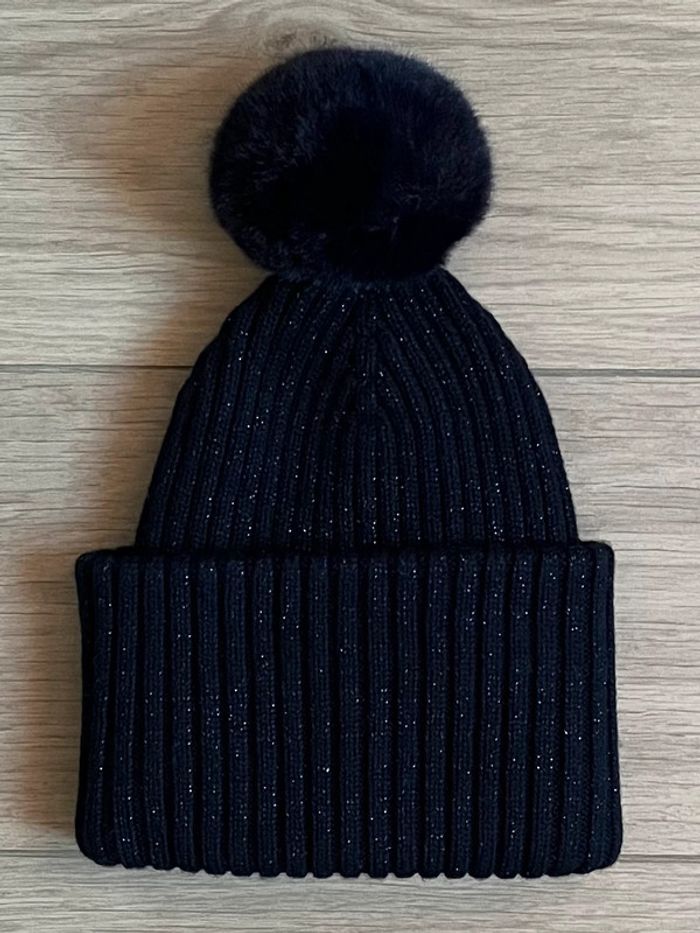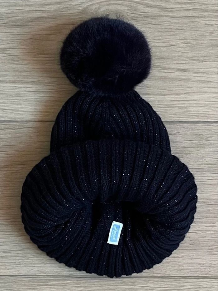 🔎 Bonnet à pompon en fausse fourrure T-53 cm en coton biologique, lurex et laine Jacadi T-3/5 ans (neuf sans étiquette, jamais porté, 1ère main)
