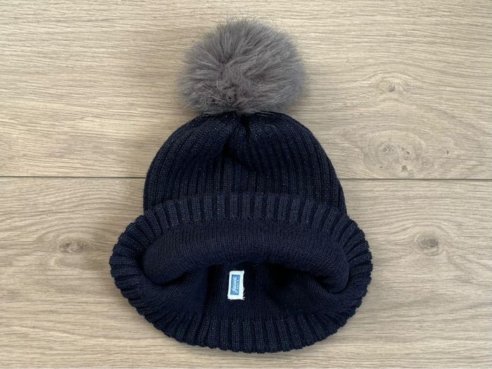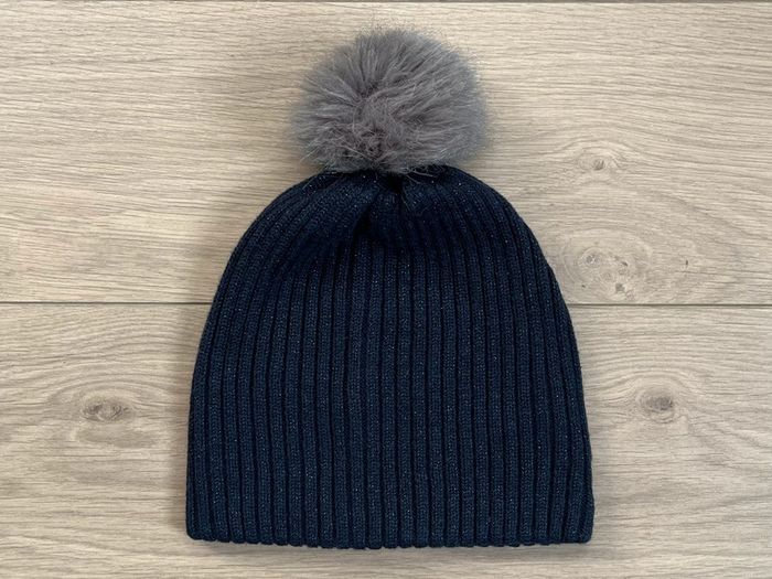 🔎 Bonnet à pompon en fausse fourrure T-53 cm en coton biologique, lurex et laine Jacadi T-3/5 ans (TBE, étiquette de taille coupée, peu porté, proche du neuf, 1ère main)
