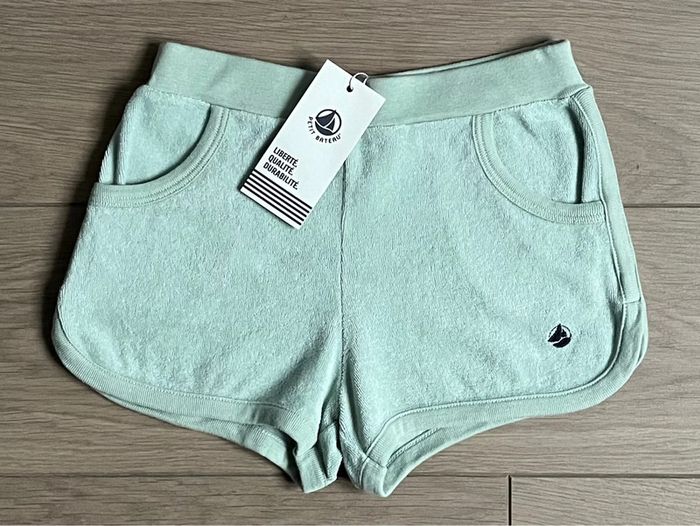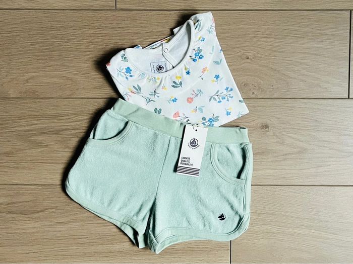 🔎 Ensemble short en bouclette éponge et t-shirt en coton Petit bateau T-5 ans (short neuf avec étiquette, t-shirt en TBE, peu porté, 1ère main)