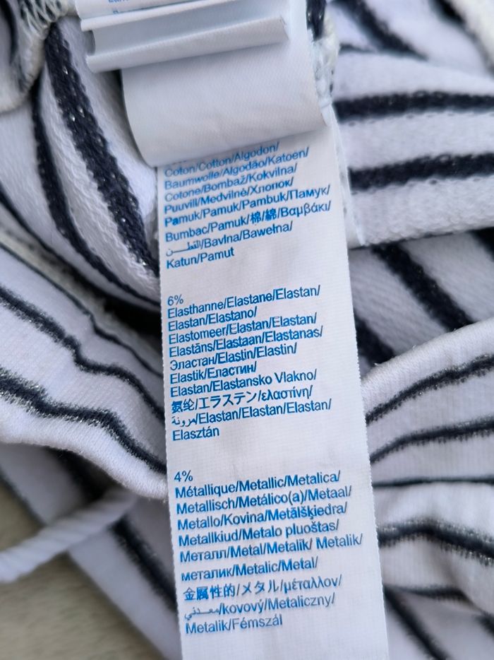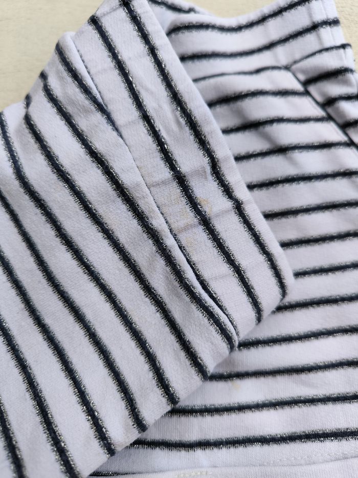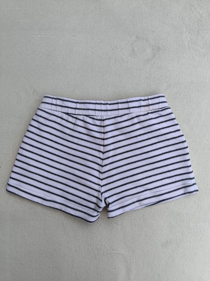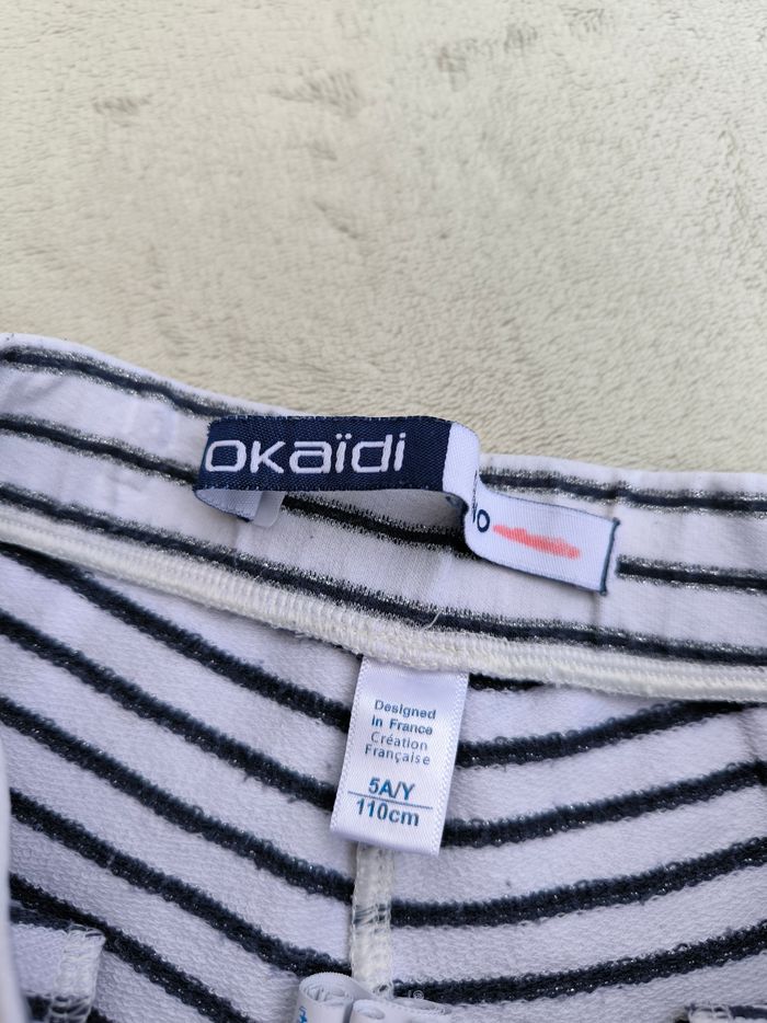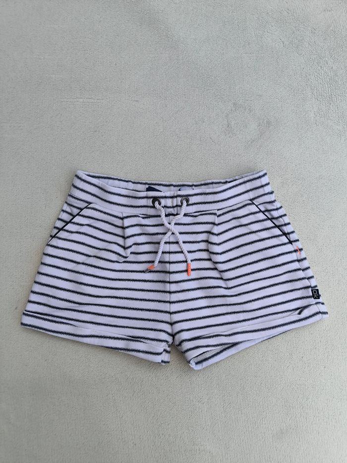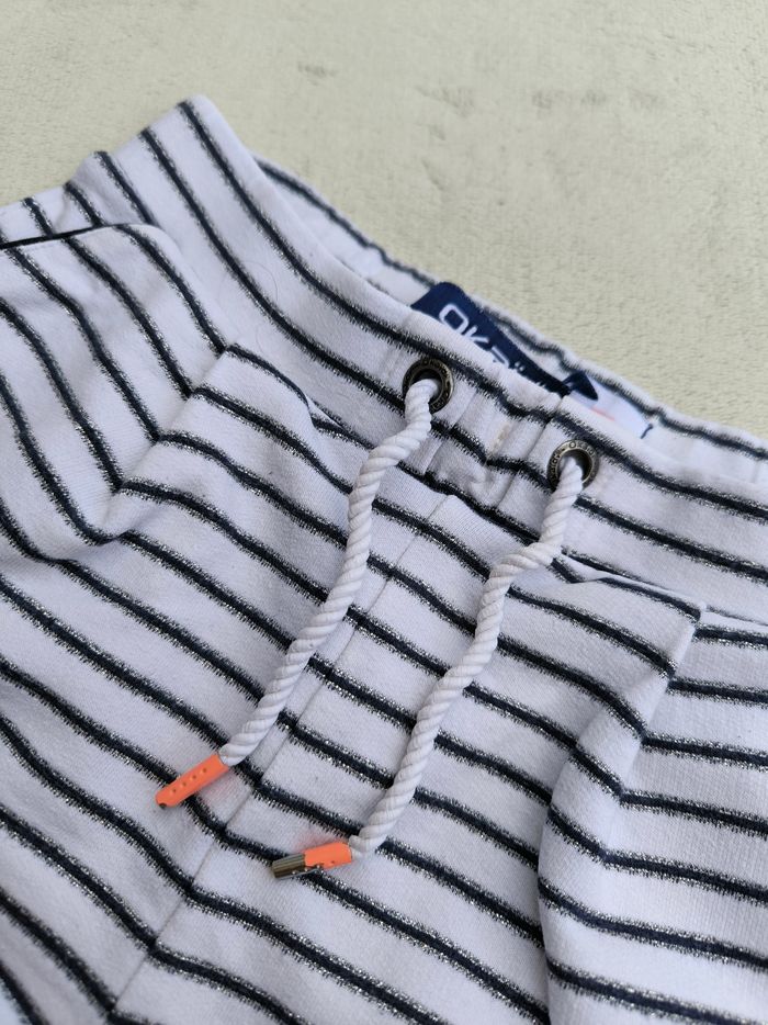 Short Marque Okaïdi Taille 5 ans, 110 cm • Coloris blanc, marine, argenté • Coupe chino • Rayures horizontales, style marinière • Taille élastique avec cordons décoratifs • 2 poches • Coton fin • Bouts cordons écailles, petites taches En bon état #evelyne_filles_5ans #evelyne_filles
