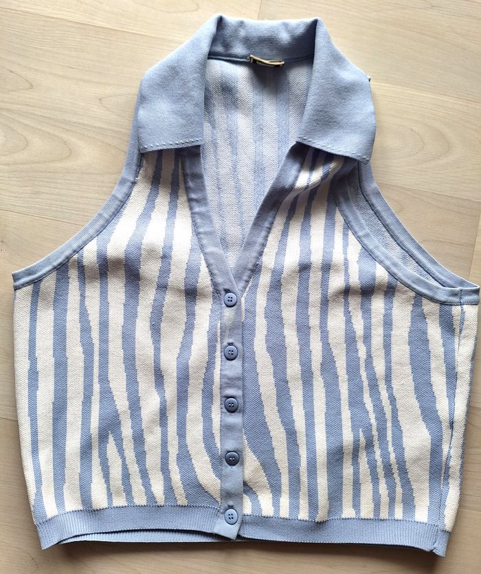 GILET SANS MANCHES AVEC COL EN MAILLE DE COULEUR BLANC ET BLEU CLAIR 5 BOUTONS BLEUS SUR L'AVANT TAILLE M/L MARQUE PIMKIE ETAT PARFAIT !