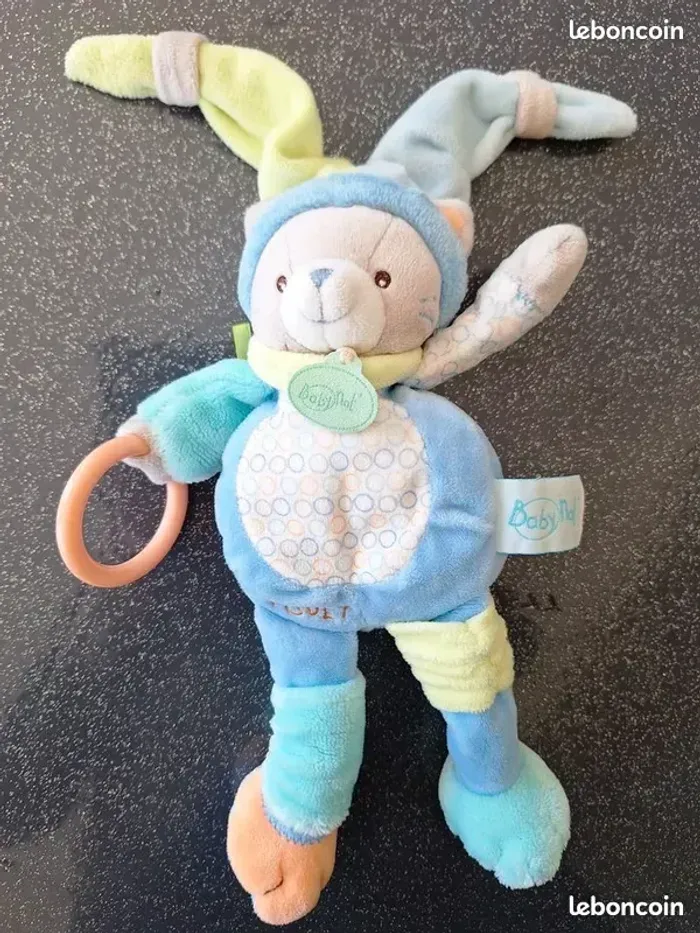 PELUCHE ACTIVITES CHAT NINO QUI MESURE 27 CM IL EST EN VELOURS BLEU, VERT ET ORANGE GRELOT DANS LA TETE ET ANNEAU EN PASTIQUE A UNE MAIN ETAT PARFAIT !