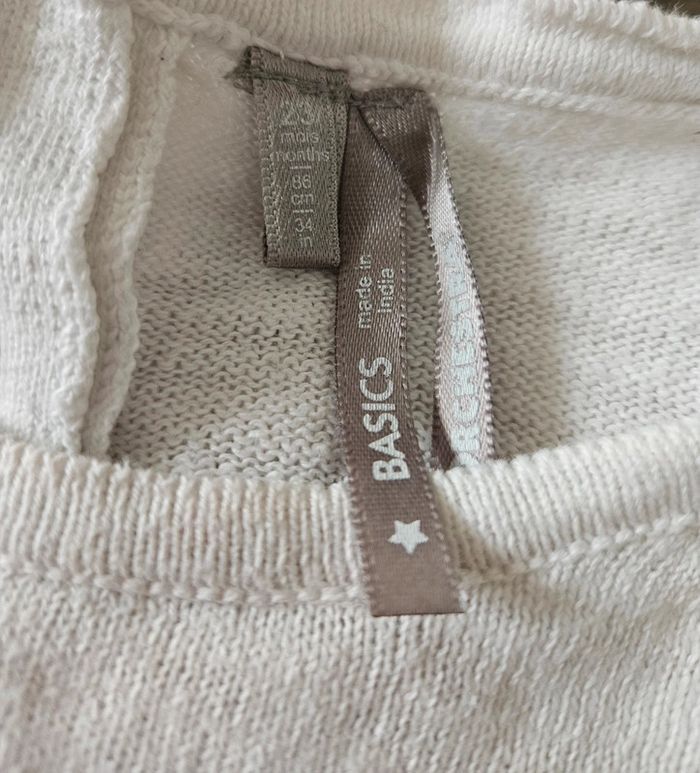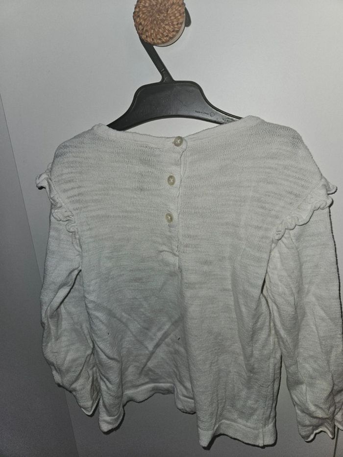 Adorable t-shirt à manches longues de la marque Orchestra, parfait pour la mi-saison. Il est en bon état général, ayant été porté plusieurs fois mais conservant tout son charme. Sa matière fine et légère est idéale pour les journées plus fraîches du printemps ou de l'automne. Le motif licorne avec sa crinière rose apporte une touche de fantaisie que les petites filles adoreront ! Les petits volants aux épaules ajoutent une finition mignonne. Fermeture boutonnée au dos pour faciliter l'habillage. Taille : 24 mois Marque : Orchestra (Basics, made in India, comme visible sur l'étiquette) Couleur : Blanc cassé / écru avec motif licorne rose Matière : Fine (parfaite pour la mi-saison) État : Bon état, porté plusieurs fois.