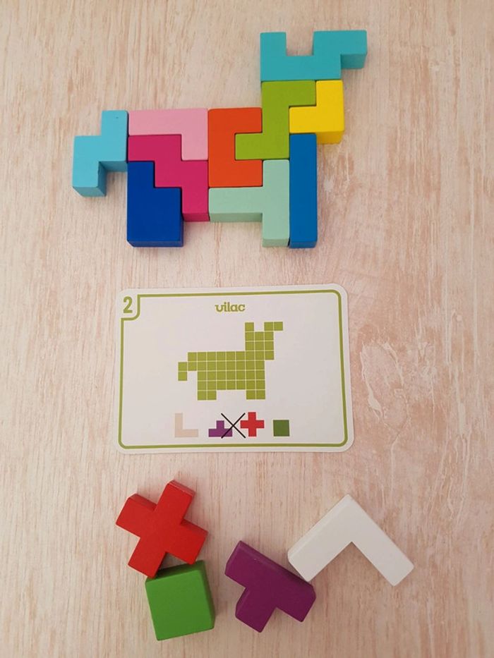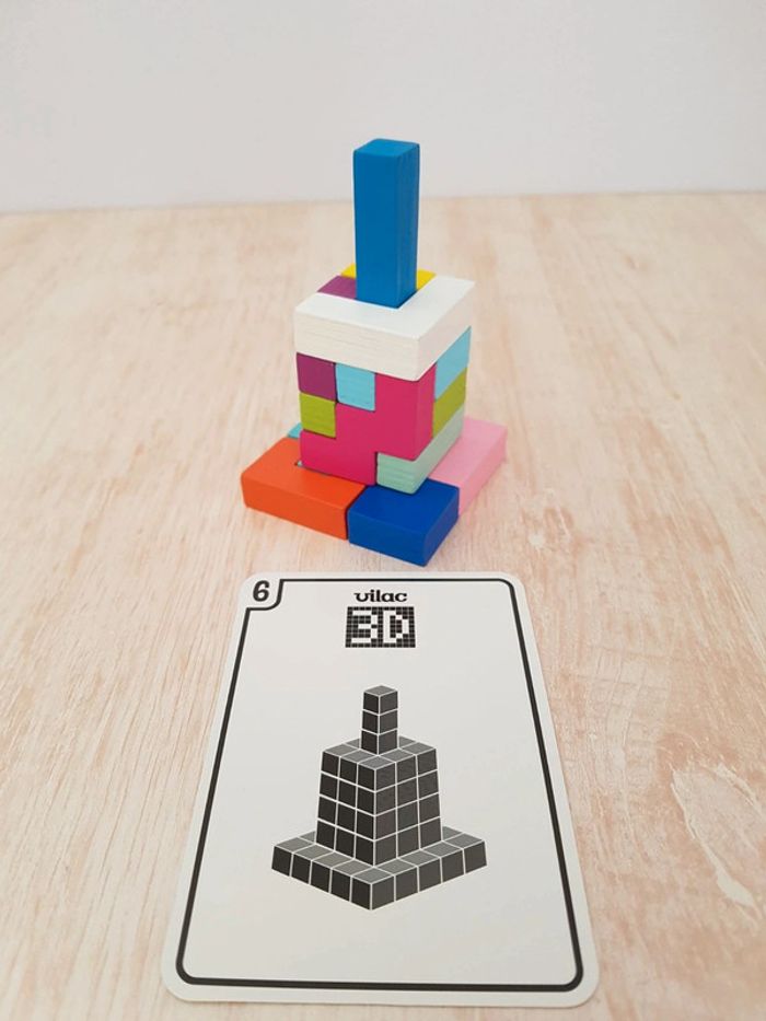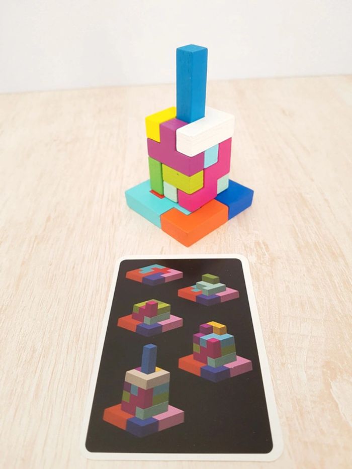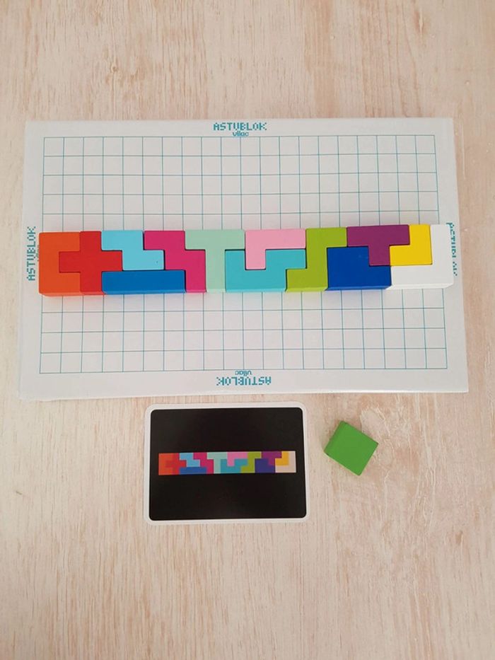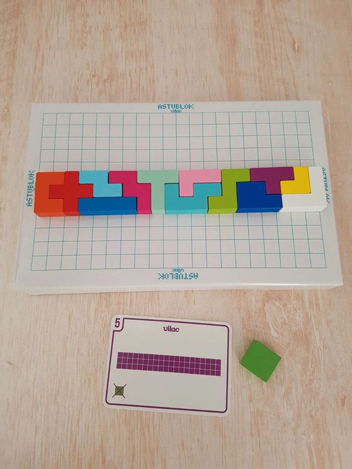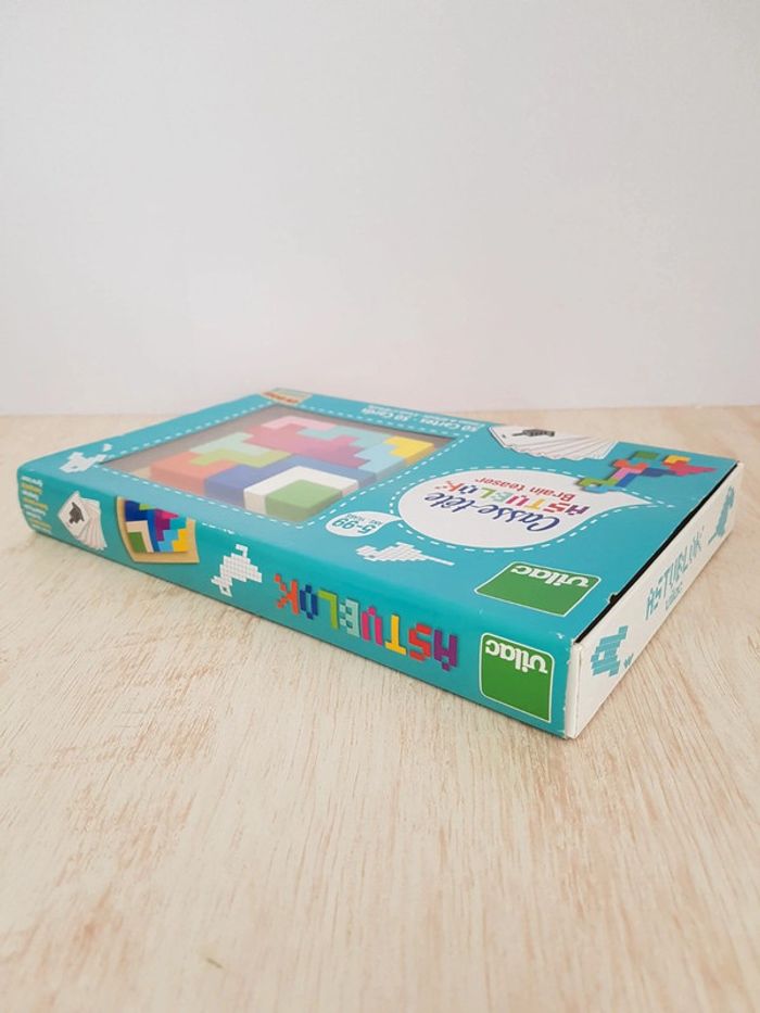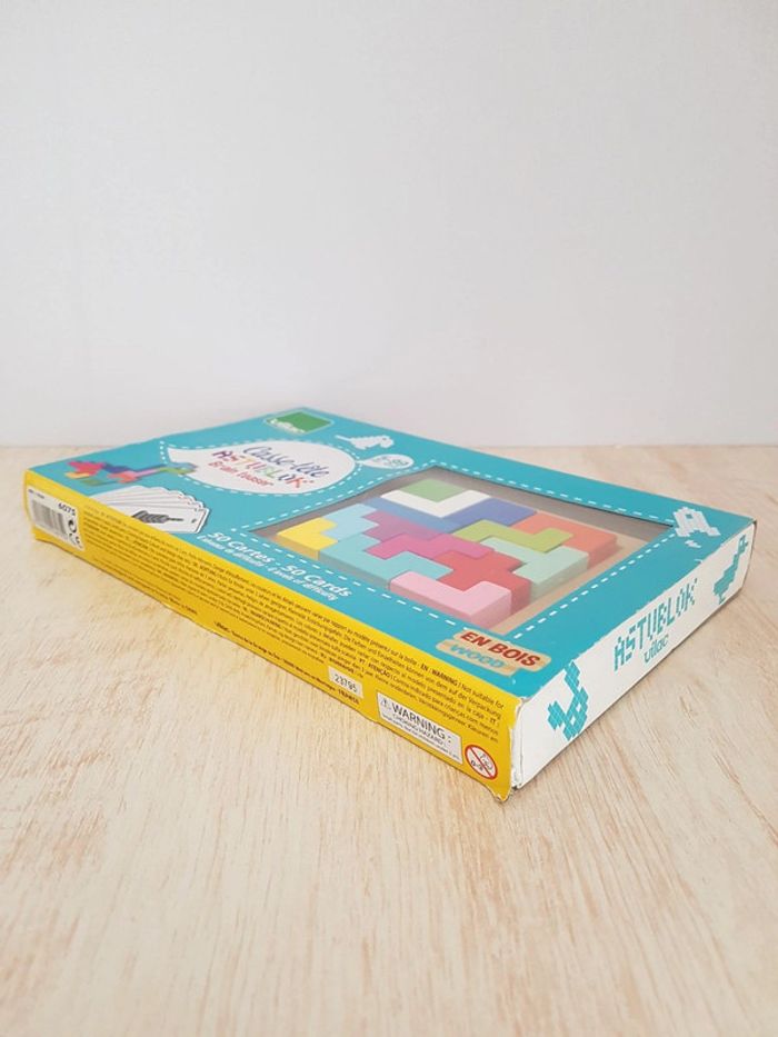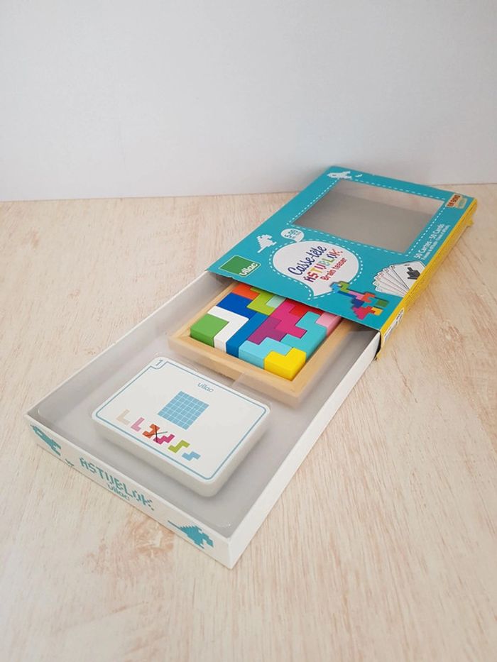 Astublok est un jeu de casse-tête brain teaser de Vilac avec des formes géométriques en bois à emboîter façon Tétris. L’objectif est de reconstituer des formes en 2D et en 3D à partir de modèles : empiler les pièces pour former des tours, reproduire à plat pour créer des animaux ou motifs. Les blocs géométriques s'embriquent les uns dans les autres comme un puzzle, et peuvent être assemblés sous différentes figures comme un tangram : robot, fleur, arbre, parapluie, pyramide, avion Un jeu éducatif montessori pour développer reconnaissance des couleurs, notion de tri, sens de l'observation, réflexion et orientation dans l'espace. La grille située au dos de la boîte permet de reproduire facilement les figures. Des milliers de combinaisons possibles pour créer des figures originales 50 cartes de 6 niveaux de difficulté différents COMPLET : 1 support, 14 pièces et 50 cartes Dimensions du plateau : 12 × 12 cm Largeur du carré vert : 2,3 cm