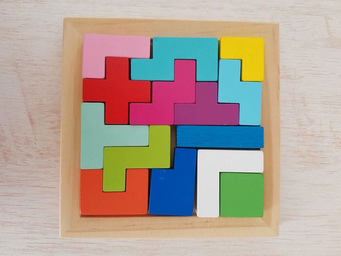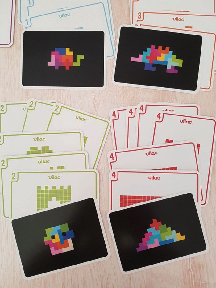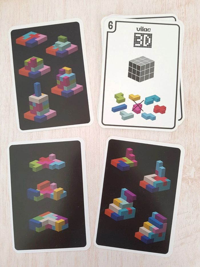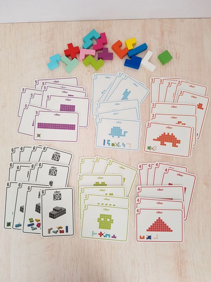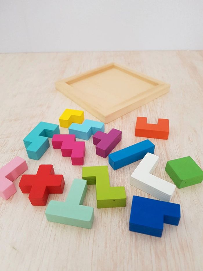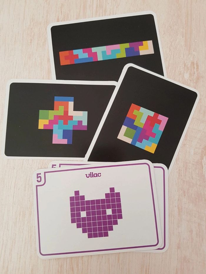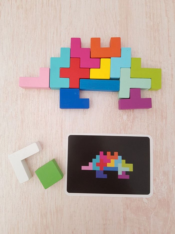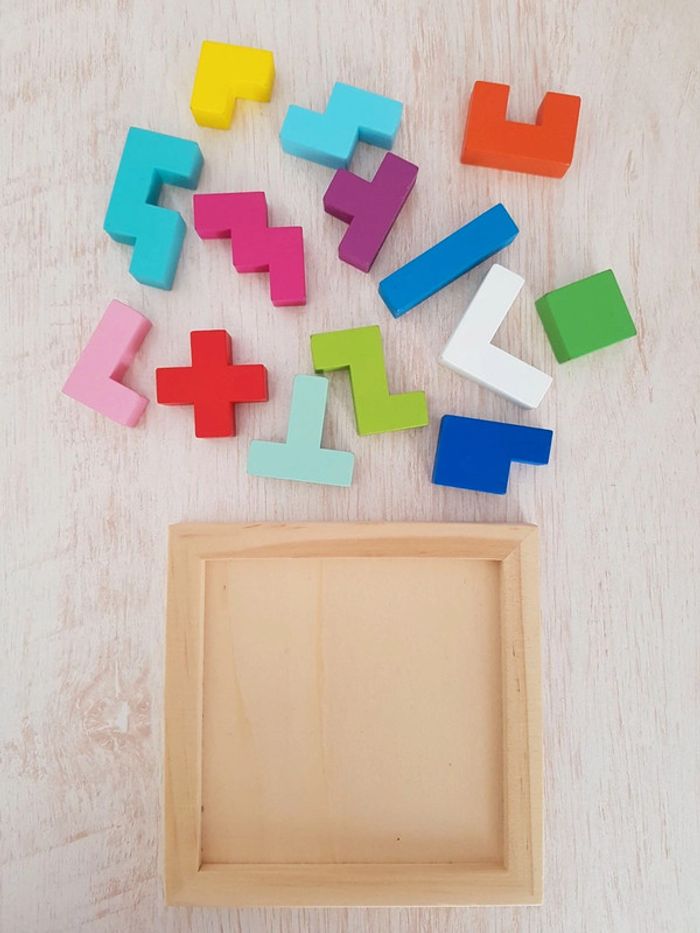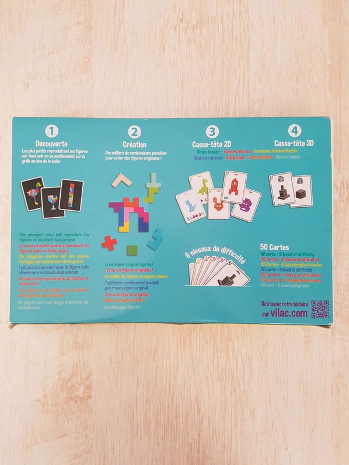 Astublok est un jeu de casse-tête brain teaser de Vilac avec des formes géométriques en bois à emboîter façon Tétris. L’objectif est de reconstituer des formes en 2D et en 3D à partir de modèles : empiler les pièces pour former des tours, reproduire à plat pour créer des animaux ou motifs. Les blocs géométriques s'embriquent les uns dans les autres comme un puzzle, et peuvent être assemblés sous différentes figures comme un tangram : robot, fleur, arbre, parapluie, pyramide, avion Un jeu éducatif montessori pour développer reconnaissance des couleurs, notion de tri, sens de l'observation, réflexion et orientation dans l'espace. La grille située au dos de la boîte permet de reproduire facilement les figures. Des milliers de combinaisons possibles pour créer des figures originales 50 cartes de 6 niveaux de difficulté différents COMPLET : 1 support, 14 pièces et 50 cartes Dimensions du plateau : 12 × 12 cm Largeur du carré vert : 2,3 cm