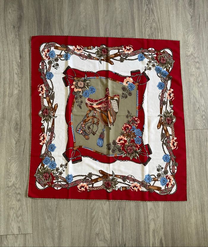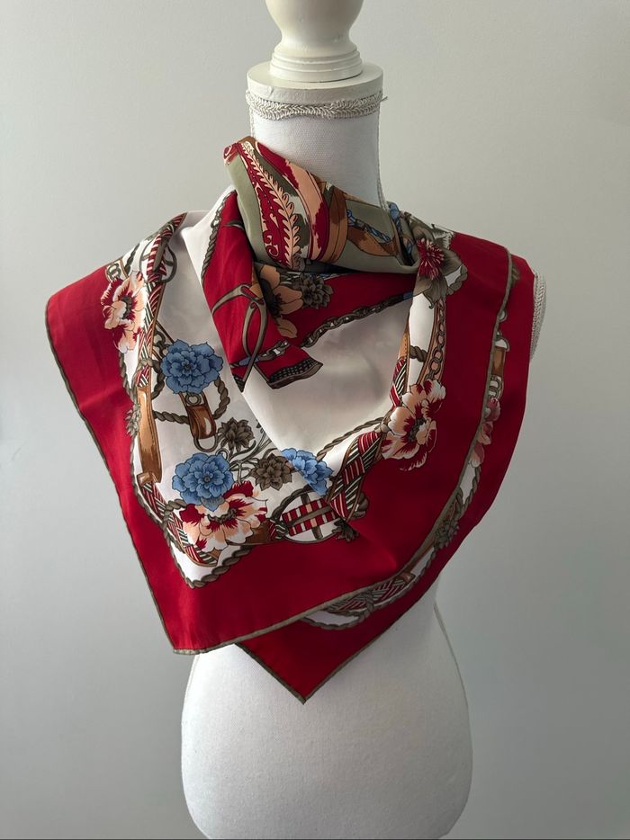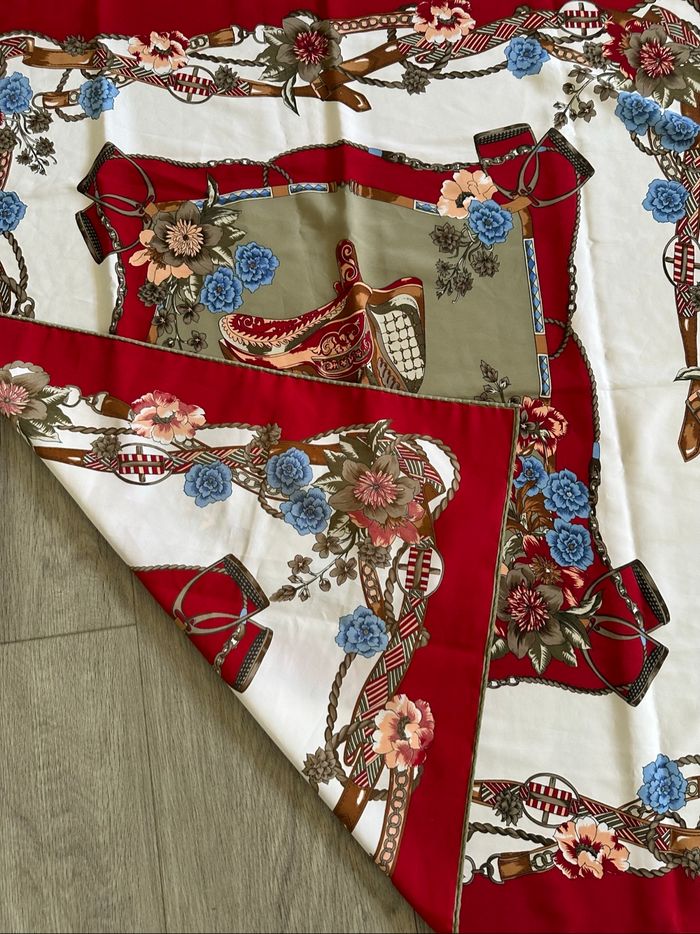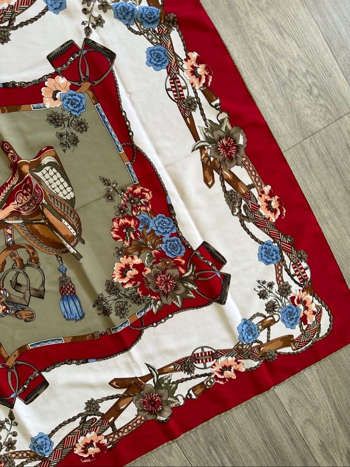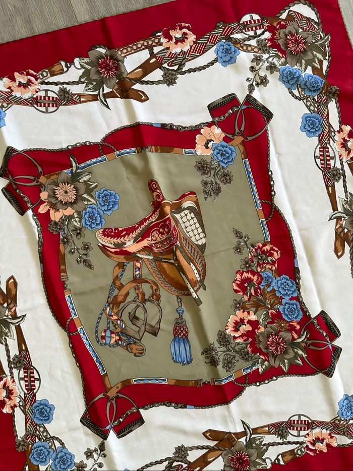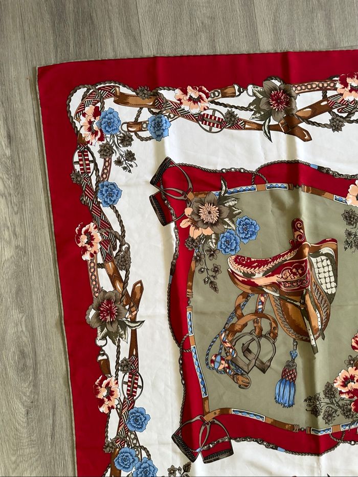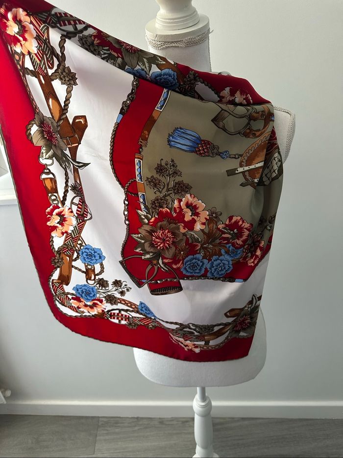 Foulard étole - Excellent état - Taille 85x85cm - Imprimés équestre, équitation, fleurs, selle - Rouge bordeaux, kaki, bleu et blanc - Vintage, années 80’ - Forme carré - Pas d’étiquette de taille ni de matière