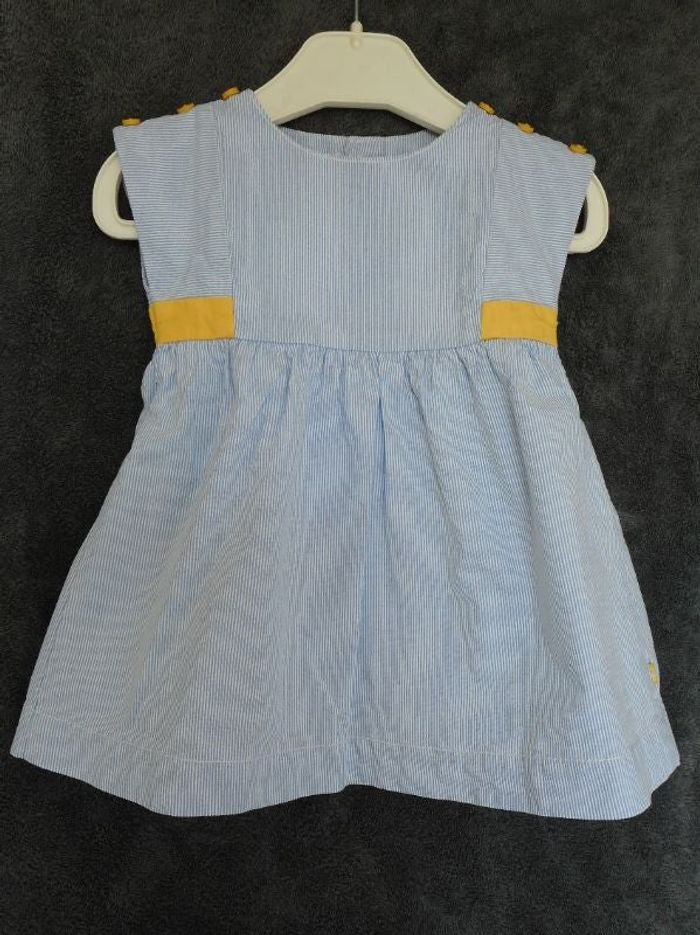 Vends une robe sans manche avec son bloomer cache couche assorti de marque Obaïbi. - Robe fines rayures bleu ciel et blanche. Entièrement doublée. Ouverture complète par boutons dans le dos. - Bloomer cache couche à fins rayures bleu ciel et blanch. Elastiqué taille et cuisses. Taille : 6 mois / 68 cm. Comme Neuve !! Portée seulement un week-end pour une fête... Prix de l'ensemble : 15 €.