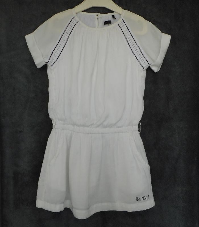 Vends une belle robe à manches courtes de marque IKKS. Robe courte de couleur blanche. Manches courtes avec revers. Elastiquée à la taille. Déco broderie / dentelle de chaque côté des manches. 2 poches. Passant pour ceinture. Entièrement doublée. Fermé par un bouton dans la dos. 100% polyester. Doublure : 100 % coton. Taille : 6 ans / 114 cm. Très bon état ! Prix : 30 €.