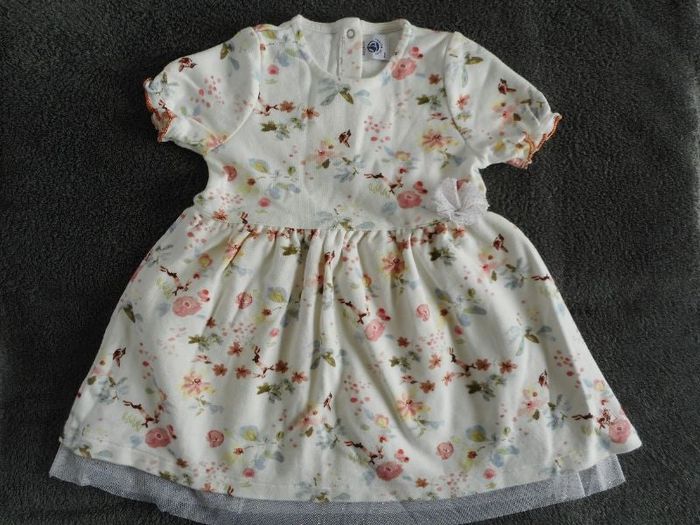 Vends une très jolie robe de marque Petit Bateau. Manches courtes légèrement élastiquées. Blanche avec légers motifs printanier. Fleur en tulle + doublure en tissu pour plus de confort. Fermée dans le dos par pressions. 100 % coton. Taille : 18 mois / 81 cm. Très bon état, comme Neuve !! Portée un seul jour pour une cérémonie !! Prix : 30 €.