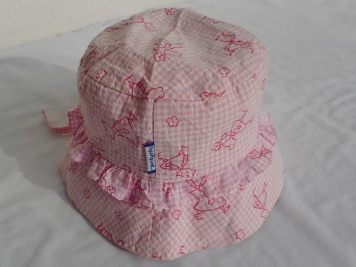 Vends un chapeau de soleil, de couleur rose et blanc de marque Papa Pique et ... Maman Coud. Tissu léger. Doublé d'une toile fine. 2 lacettes pour l'attacher sous le cou. Vichy rose et blanc avec motif souris rose. Taille : 1 (environ 48 cm = 12 mois) Très bon état !! Comme neuf. Prix : 7 €