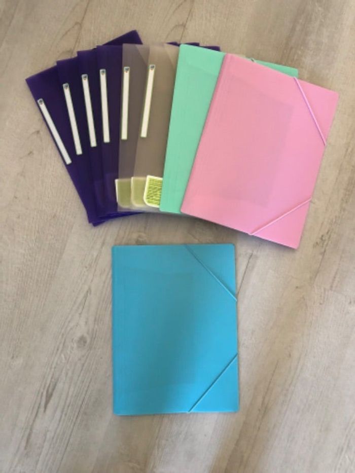 Bonjour NEUVES 1 chemise en polypropylène 3 rabats avec élastiques Extensible Avec étiquettes sur la tranche (Oxford) Marque: OXFORD Extension: 2cm -3 violettes -2 beiges Marque: VIQUEL Extension: 2,5cm -1 rose pastel -1 vert pastel Quantité disponible: 7 —-N’hésitez pas à me proposer un lot avec mes autres annonces de fournitures—- Cdt