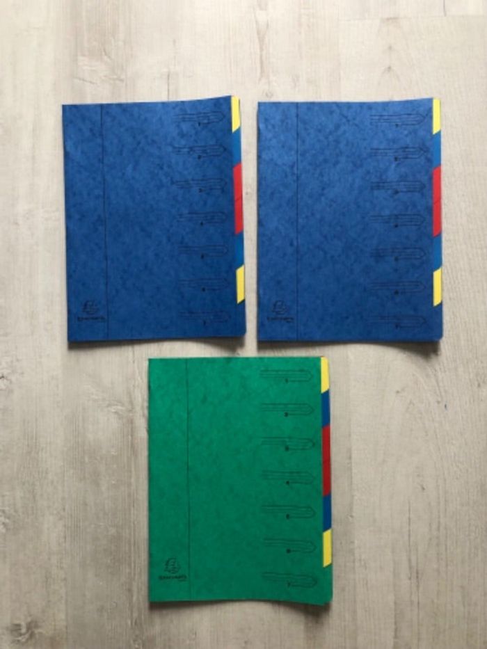 Bonjour NEUFS 1 Trieur cartonné Carton épais 7 onglets Marque: Exacompta Pages de couleur Format: 24X32 Quantité disponible: 2 - 1 bleu - 1 vert —-N’hésitez pas à me proposer votre lot avec mes autres annonces de fournitures, sur demande—- Cdt