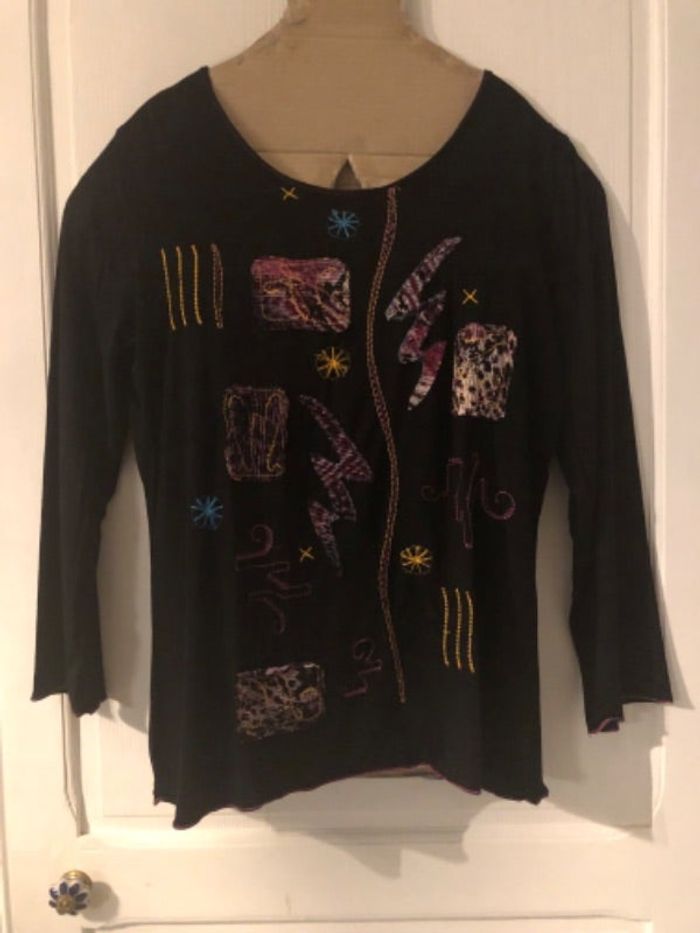 Bonjour Très bon état T 42-44, très extensible Dimensions sur la dernière photo Haut noir avec broderies Encolure ronde Manches longues Dos uni noir Devant avec motifs brodés et morceaux de tissus cousus Bouts des manches et bas brodés Étiquettes coupées Acheté en boutique Cdlt