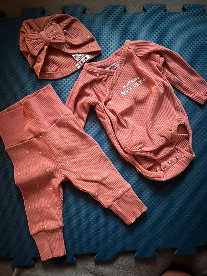 Ensemble évolutif madame sourire Gémo 3M (utilisable jusqu’à 6M environ) body legging et bonnet porté 2x, d’autres produits, accessoires et vêtements bébé disponible dans mon dressing