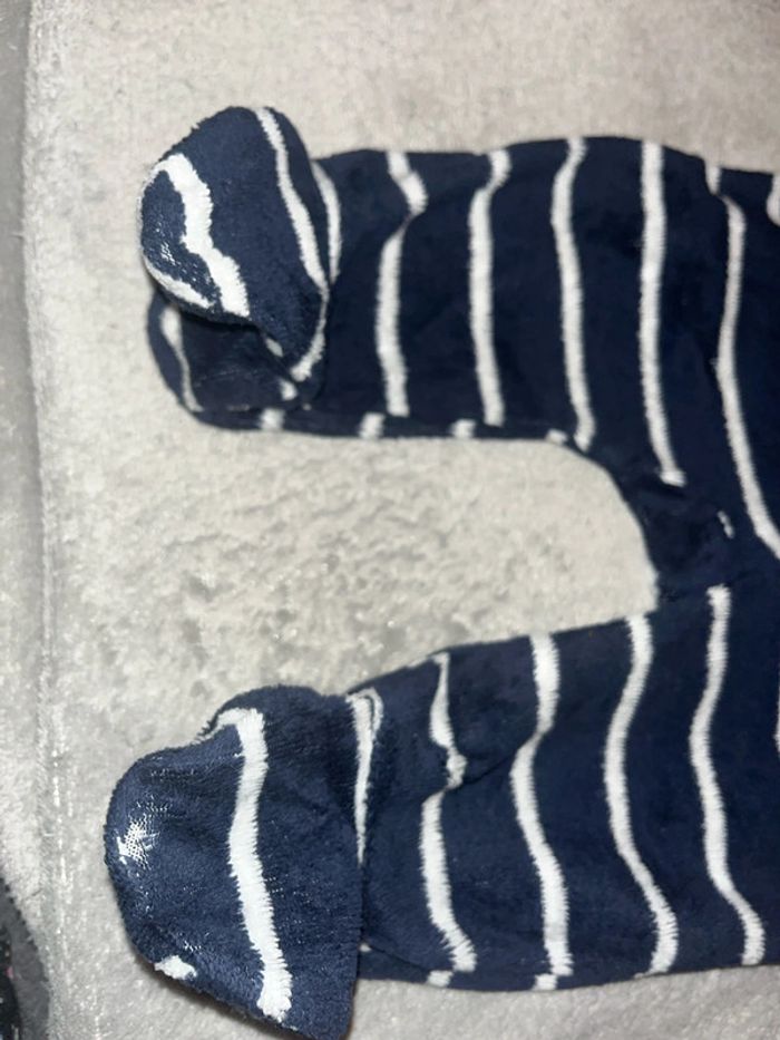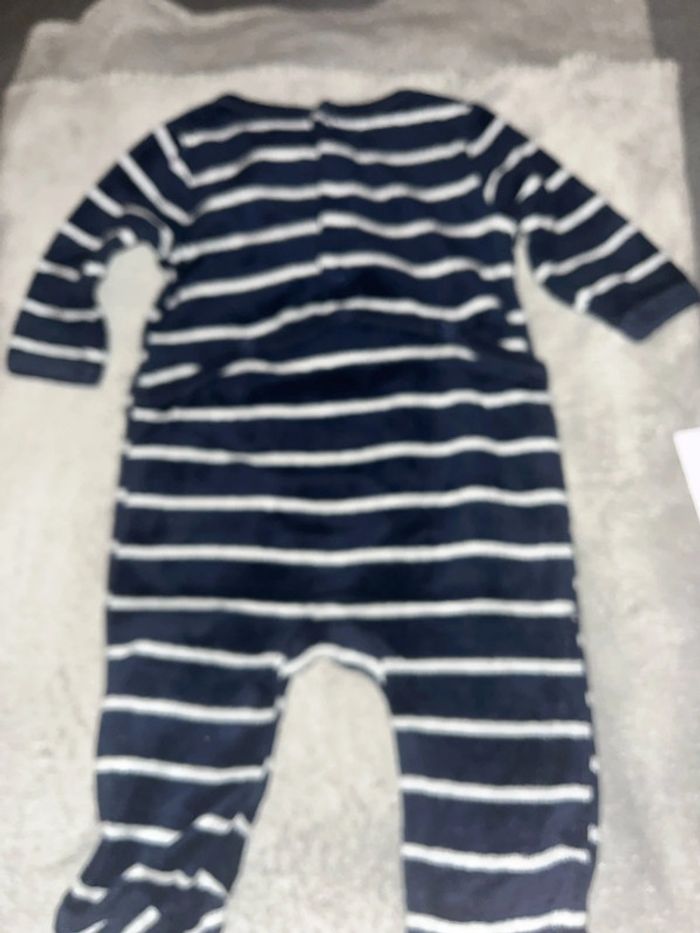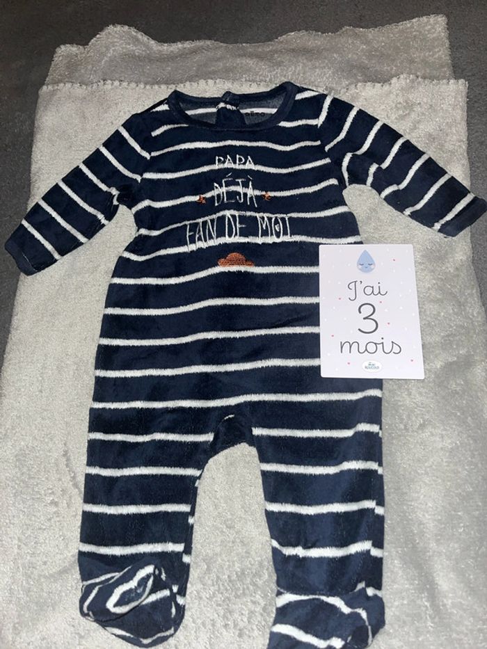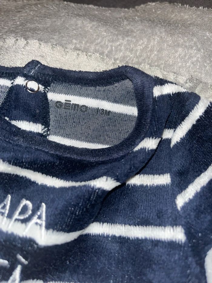 Pyjama velours chaud hiver papa déjà fan de moi Gémo mixte taille 3M porté plusieurs fois avec défaut au niveau des pieds il manque de la matière voir dernière photo d’où le prix d’autres produits et vêtements bébé disponible dans mon dressing