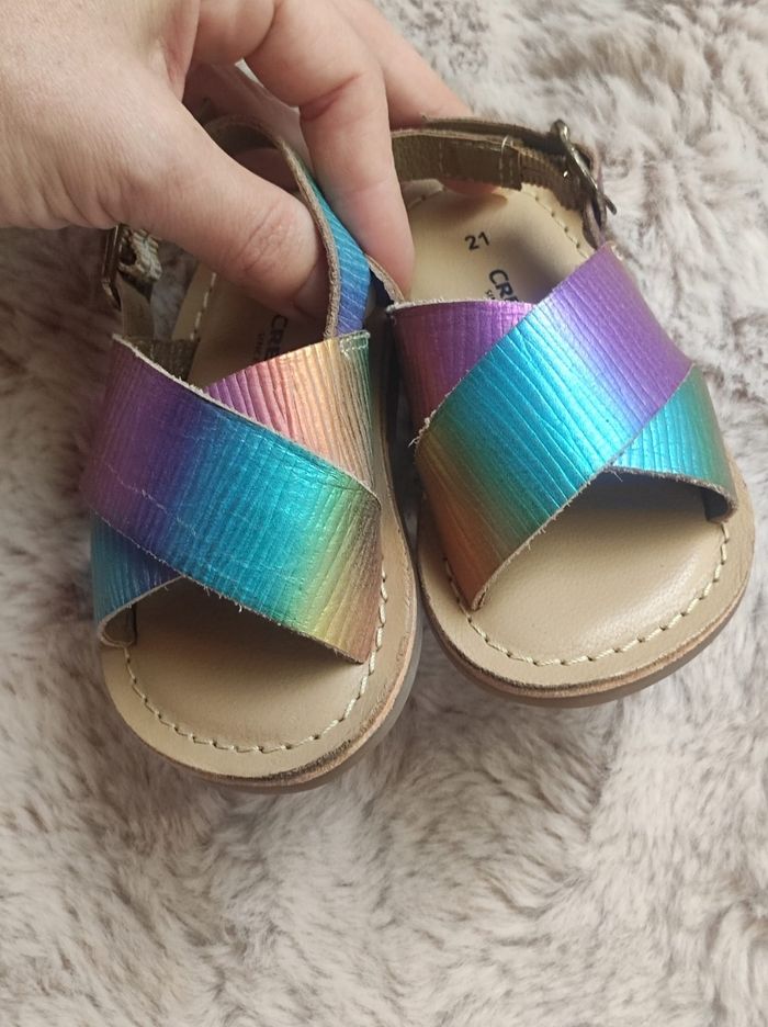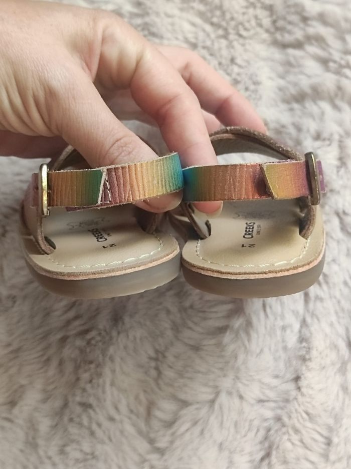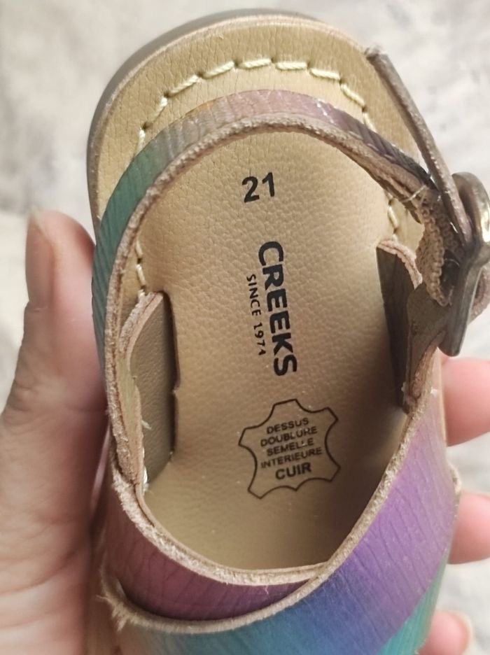 superbe paires de sandales multicolore, a peine porter. En très bon état. En cuir ( dessus, doublure, semelles et intérieur ). Marque creeks en taille 21.