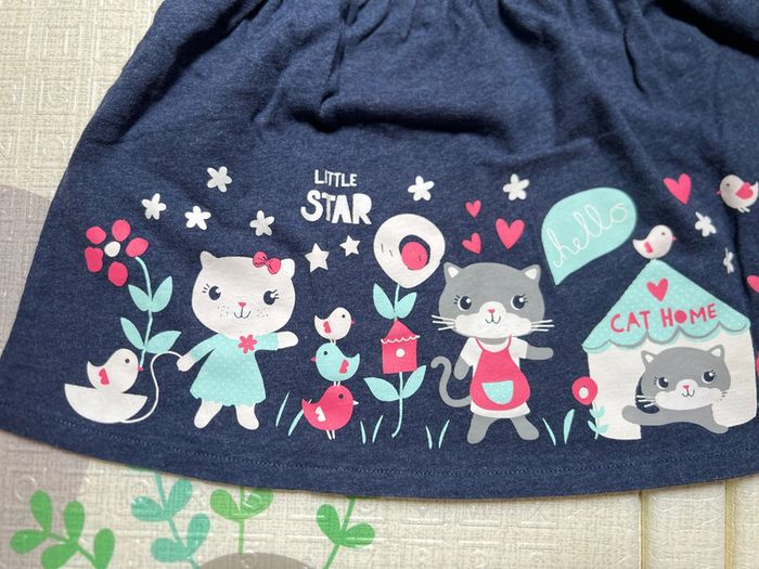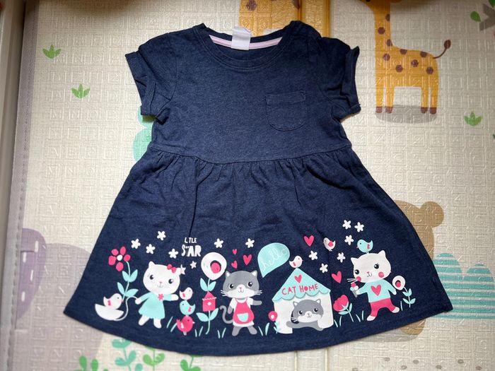 Robe d’été bleu jean « Little star » chats, oiseaux, fleurs Flocage en parfait état 9-12 mois 80cm