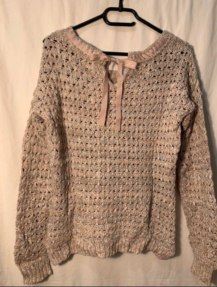 Pull rose, gris et blanc avec fil brillant cuivré. noeud dans le dos taille:1/36/S #pull36rachel1911